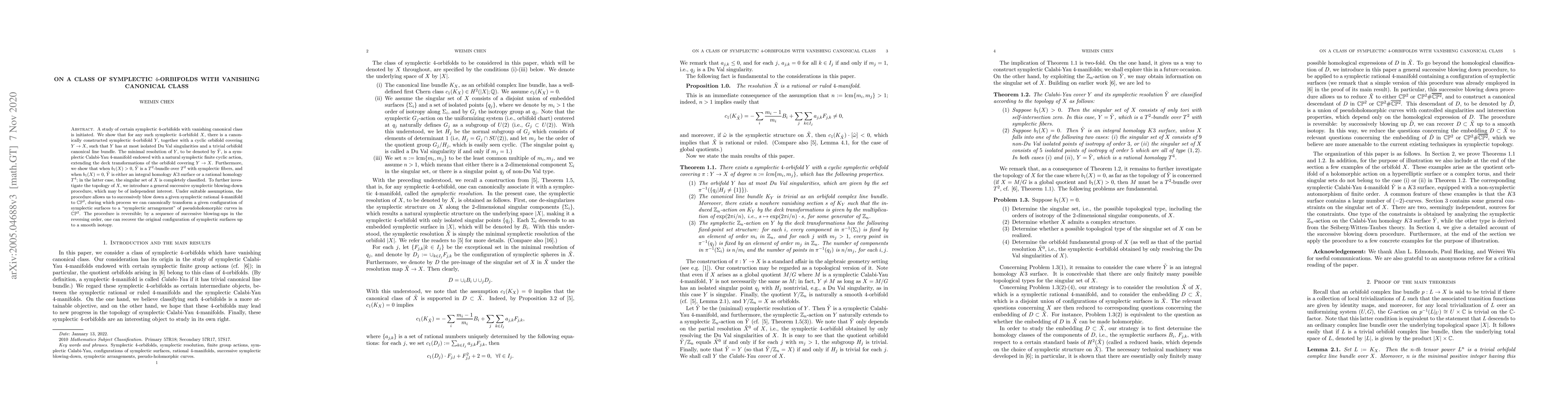 A study of certain symplectic $4$-orbifolds with vanishing canonical class is initiated. We show that for any such symplectic $4$-orbifold $X$, there is a canonically constructed symplectic $4$-orbifold $Y$, together with a cyclic orbifold covering $Y\rightarrow X$, such that $Y$ has at most isolated Du Val singularities and a trivial orbifold canonical line bundle. The minimal resolution of $Y$, to be denoted by $\tilde{Y}$, is a symplectic Calabi-Yau $4$-manifold endowed with a natural symplectic finite cyclic action, extending the deck transformations of the orbifold covering $Y\rightarrow X$. Furthermore, we show that when $b_1(X)>0$, $\tilde{Y}$ is a $T^2$-bundle over $T^2$ with symplectic fibers, and when $b_1(X)=0$, $\tilde{Y}$ is either an integral homology $K3$ surface or a rational homology $T^4$; in the latter case, the singular set of $X$ is completely classified. To further investigate the topology of $X$, we introduce a general successive symplectic blowing-down procedure, which may be of independent interest. Under suitable assumptions, the procedure allows us to successively blow down a given symplectic rational $4$-manifold to $CP^2$, during which process we can canonically transform a given configuration of symplectic surfaces to a "symplectic arrangement" of pseudoholomorphic curves in $CP^2$. The procedure is reversible; by a sequence of successive blowing-ups in the reversing order, one can recover the original configuration of symplectic surfaces up to a smooth isotopy.