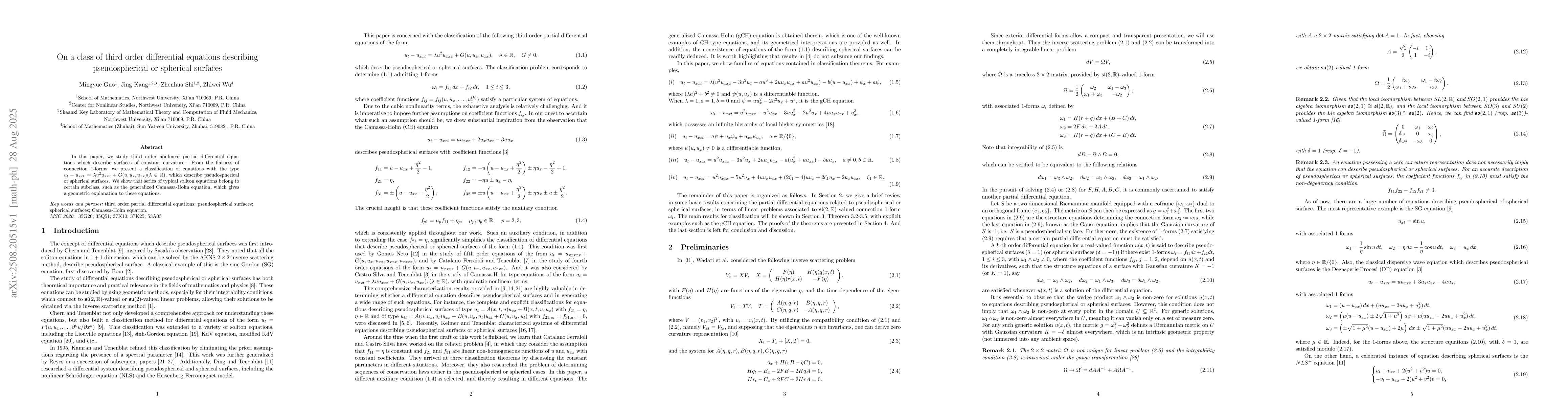 In this paper, we study third order nonlinear partial differential equations which describe surfaces of constant curvature. From the flatness of connection 1-forms, we present a classification of equations with the type $u_t - u_{xxt} = \lambda u^2 u_{xxx} + G(u, u_x, u_{xx}) (\lambda\in\mathbb{R})$, which describe pseudospherical or spherical surfaces. We show that series of typical soliton equations belong to certain subclass, such as the generalized Camassa-Holm equation, which gives a geometric explanation to these equations.