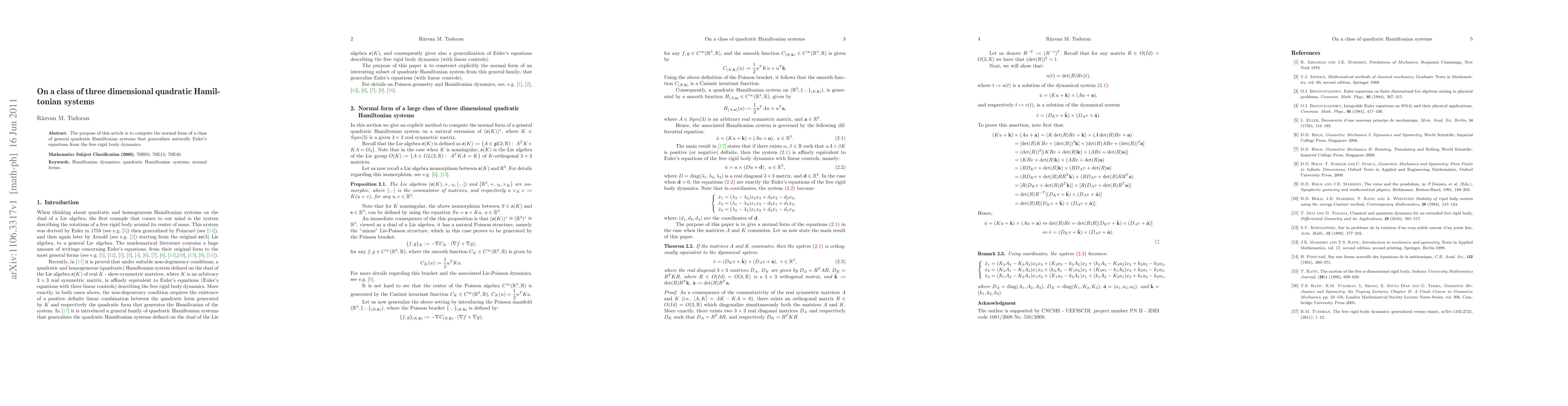 The purpose of this article is to compute the normal form of a class of general quadratic Hamiltonian systems that generalizes naturally Euler's equations from the free rigid body dynamics.