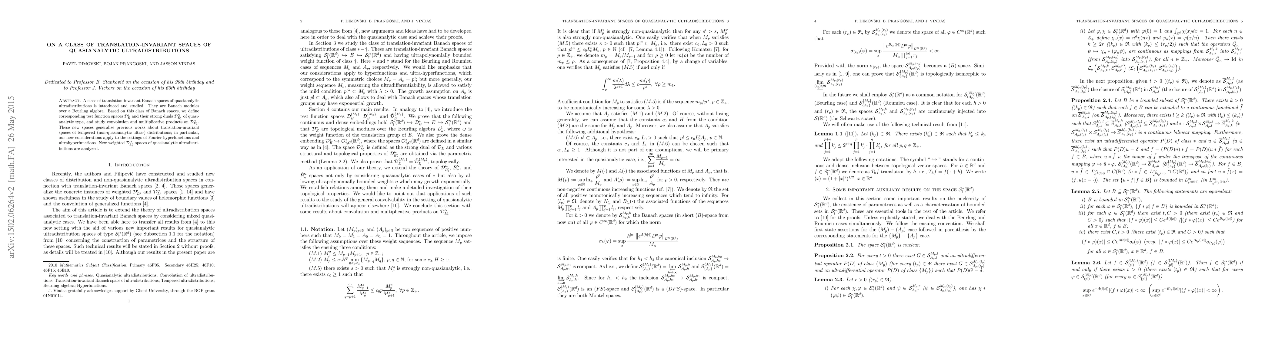 This paper introduces a class of translation-invariant Banach spaces of quasianalytic ultradistributions, which are Banach modules over a Beurling algebra. It defines corresponding test function spaces and their strong duals, studying convolution and multiplicative products, and generalizes previous works on translation-invariant spaces of tempered distributions.