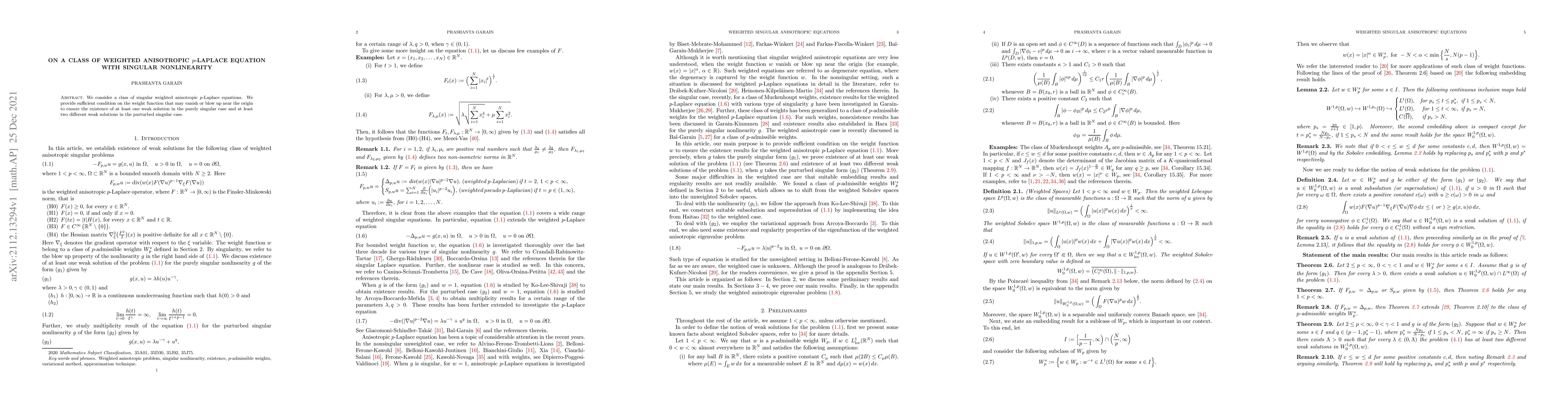 We consider a class of singular weighted anisotropic $p$-Laplace equations. We provide sufficient condition on the weight function that may vanish or blow up near the origin to ensure the existence of at least one weak solution in the purely singular case and at least two different weak solutions in the purturbed singular case.