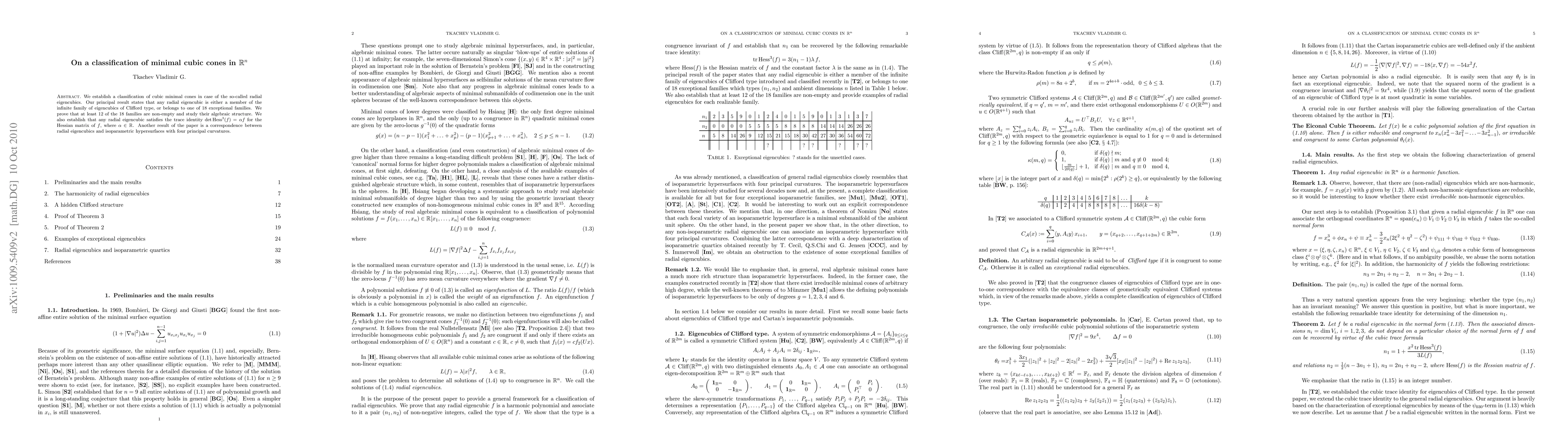 Researchers classify cubic minimal cones in R^n, finding 18 exceptional families that satisfy a trace identity and correlating with isoparametric hypersurfaces.