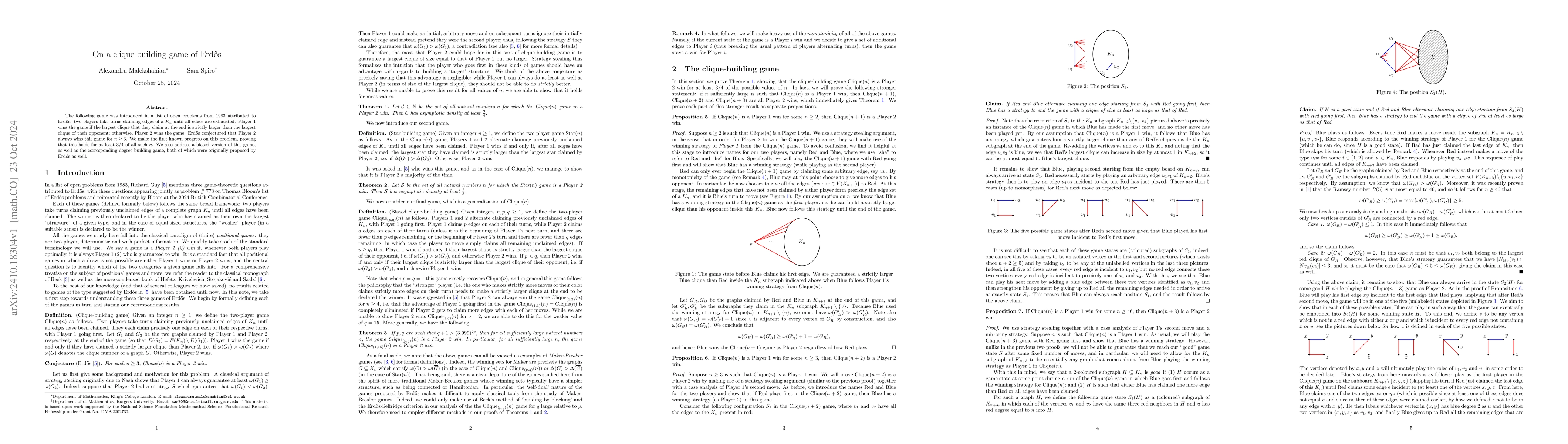 The following game was introduced in a list of open problems from 1983 attributed to Erd\H{o}s: two players take turns claiming edges of a $K_n$ until all edges are exhausted. Player 1 wins the game if the largest clique that they claim at the end is strictly larger than the largest clique of their opponent; otherwise, Player 2 wins the game. Erd\H{o}s conjectured that Player 2 always wins this game for $n\geq 3$. We make the first known progress on this problem, proving that this holds for at least $3/4$ of all such $n$. We also address a biased version of this game, as well as the corresponding degree-building game, both of which were originally proposed by Erd\H{o}s as well.