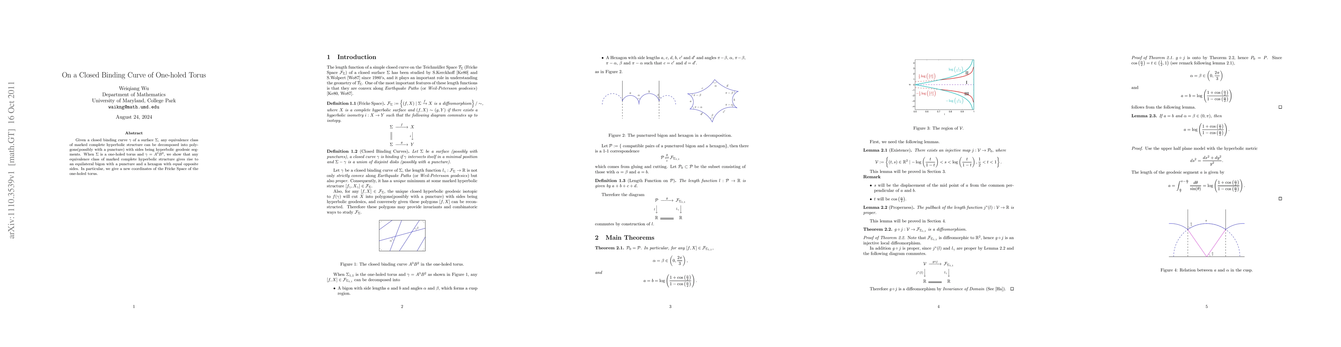 Given a closed binding curve $\gamma$ of a surface $\Sigma$, any equivalence class of marked complete hyperbolic structure can be decomposed into polygons(possibly with a puncture) with sides being hyperbolic geodesic segments. When $\Sigma$ is a one-holed torus and $\gamma = A^3 B^2$, we show that any equivalence class of marked complete hyperbolic structure gives rise to an equilateral bigon with a puncture and a hexagon with equal opposite sides. In particular, we give a new coordinates of the Fricke Space of the one-holed torus.