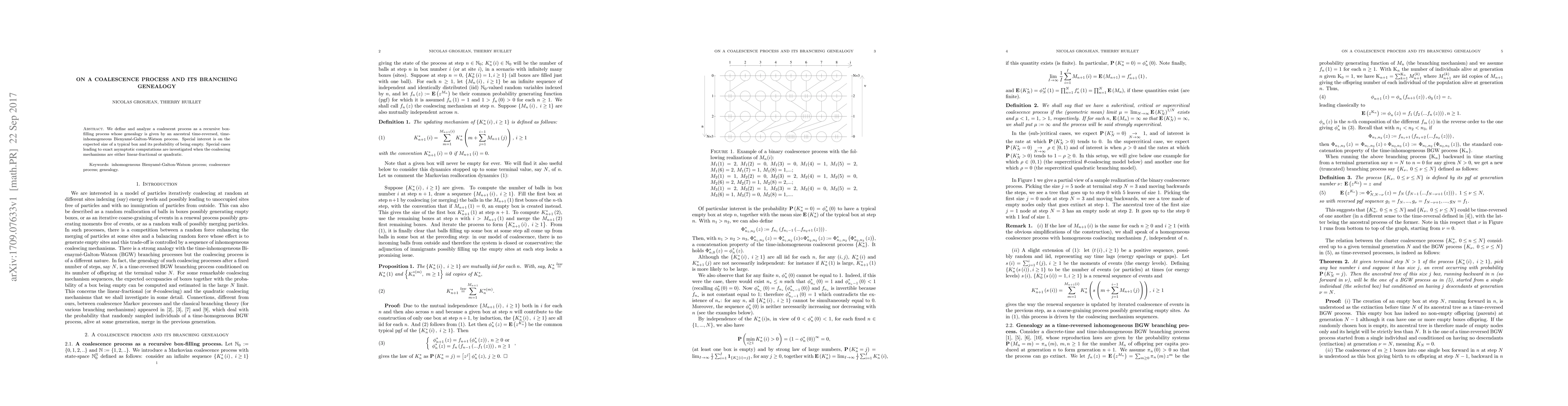 This paper defines and analyzes a coalescent process as a recursive box-filling mechanism, focusing on its branching genealogy modeled by a time-reversed Bienyamé-Galton-Watson process. It investigates the expected size and emptiness probability of typical boxes, with exact asymptotic computations for linear-fractional and quadratic coalescing mechanisms.