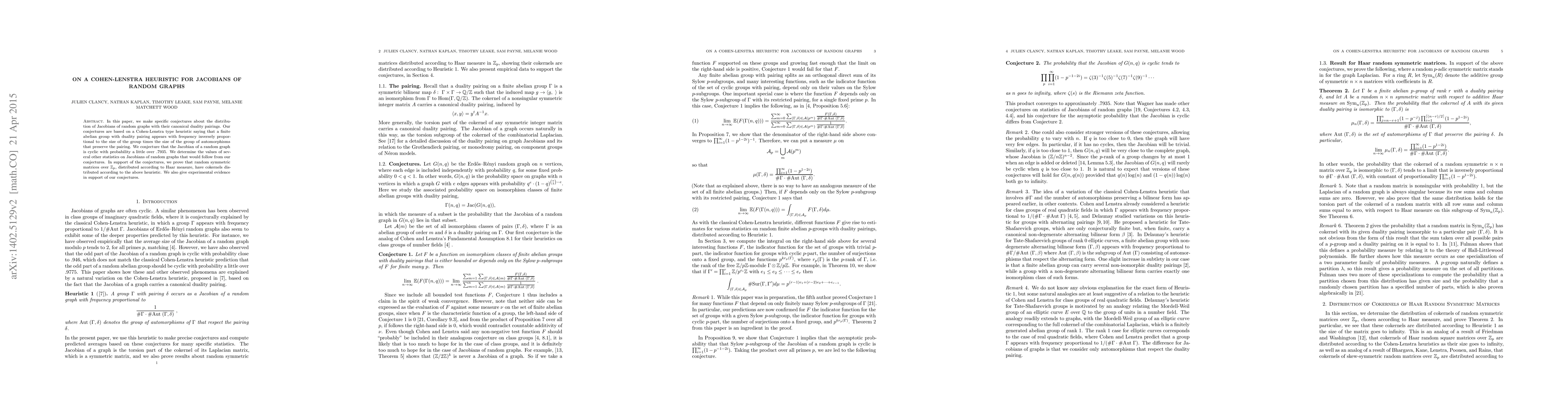 This paper proposes conjectures about the distribution of Jacobians of random graphs based on a Cohen-Lenstra heuristic, suggesting that these Jacobians are cyclic with a probability of slightly over 79.35%. It supports these conjectures by proving that random symmetric matrices over p-adic integers have cokernels following the heuristic and provides experimental evidence.