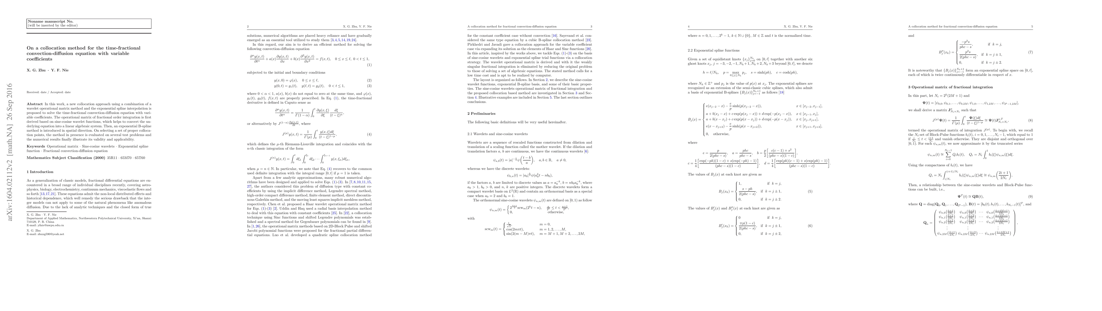 This paper proposes a new collocation method combining wavelet operational matrices and exponential spline interpolation to solve the time-fractional convection-diffusion equation with variable coefficients. The method's effectiveness is demonstrated through numerical results on several test problems.