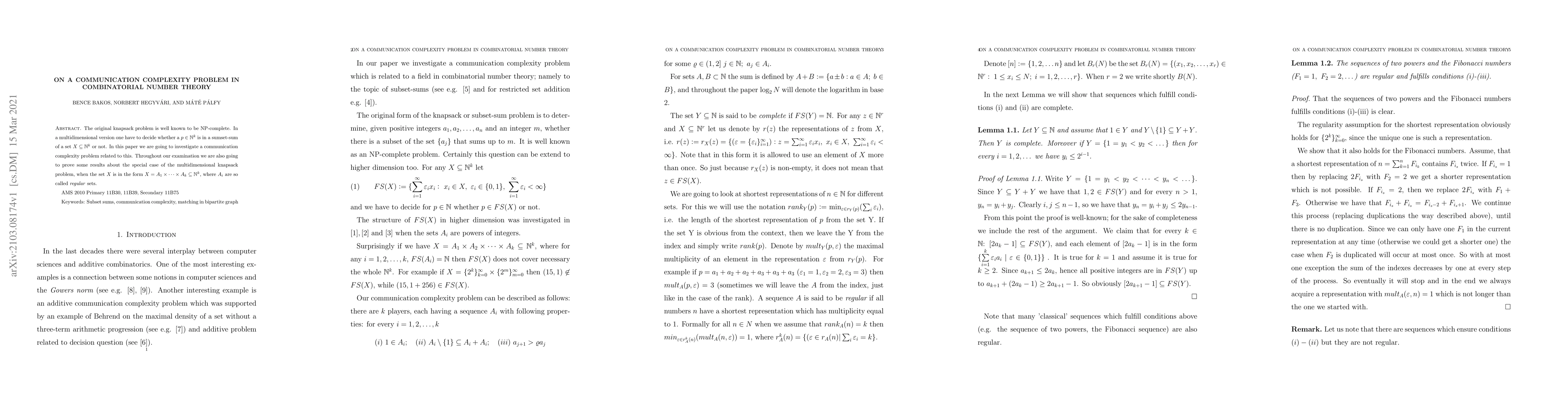 This paper investigates a communication complexity problem related to a multidimensional version of the sumset-sum problem in combinatorial number theory. It focuses on whether information can be efficiently shared between two parties to solve this NP-complete problem.