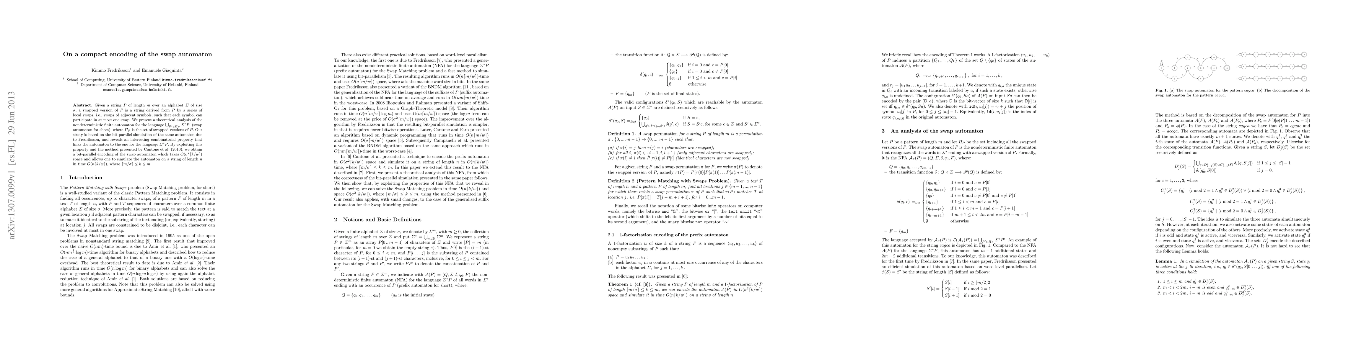 Given a string $P$ of length $m$ over an alphabet $\Sigma$ of size $\sigma$, a swapped version of $P$ is a string derived from $P$ by a series of local swaps, i.e., swaps of adjacent symbols, such that each symbol can participate in at most one swap. We present a theoretical analysis of the nondeterministic finite automaton for the language $\bigcup_{P'\in\Pi_P}\Sigma^*P'$ (swap automaton for short), where $\Pi_P$ is the set of swapped versions of $P$. Our study is based on the bit-parallel simulation of the same automaton due to Fredriksson, and reveals an interesting combinatorial property that links the automaton to the one for the language $\Sigma^*P$. By exploiting this property and the method presented by Cantone et al. (2010), we obtain a bit-parallel encoding of the swap automaton which takes $O(\sigma^2\ceil{k/w})$ space and allows one to simulate the automaton on a string of length $n$ in time $O(n\ceil{k/w})$, where $\ceil{m/\sigma}\le k\le m$.