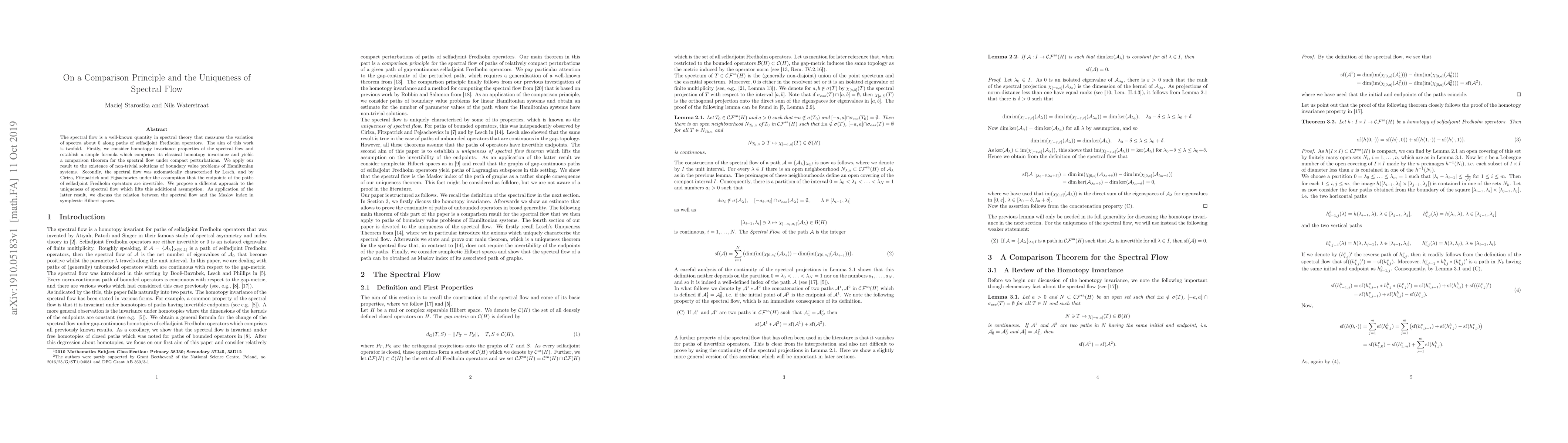 The spectral flow is a well-known quantity in spectral theory that measures the variation of spectra about $0$ along paths of selfadjoint Fredholm operators. The aim of this work is twofold. Firstly, we consider homotopy invariance properties of the spectral flow and establish a simple formula which comprises its classical homotopy invariance and yields a comparison theorem for the spectral flow under compact perturbations. We apply our result to the existence of non-trivial solutions of boundary value problems of Hamiltonian systems. Secondly, the spectral flow was axiomatically characterised by Lesch, and by Ciriza, Fitzpatrick and Pejsachowicz under the assumption that the endpoints of the paths of selfadjoint Fredholm operators are invertible. We propose a different approach to the uniqueness of spectral flow which lifts this additional assumption. As application of the latter result, we discuss the relation between the spectral flow and the Maslov index in symplectic Hilbert spaces.