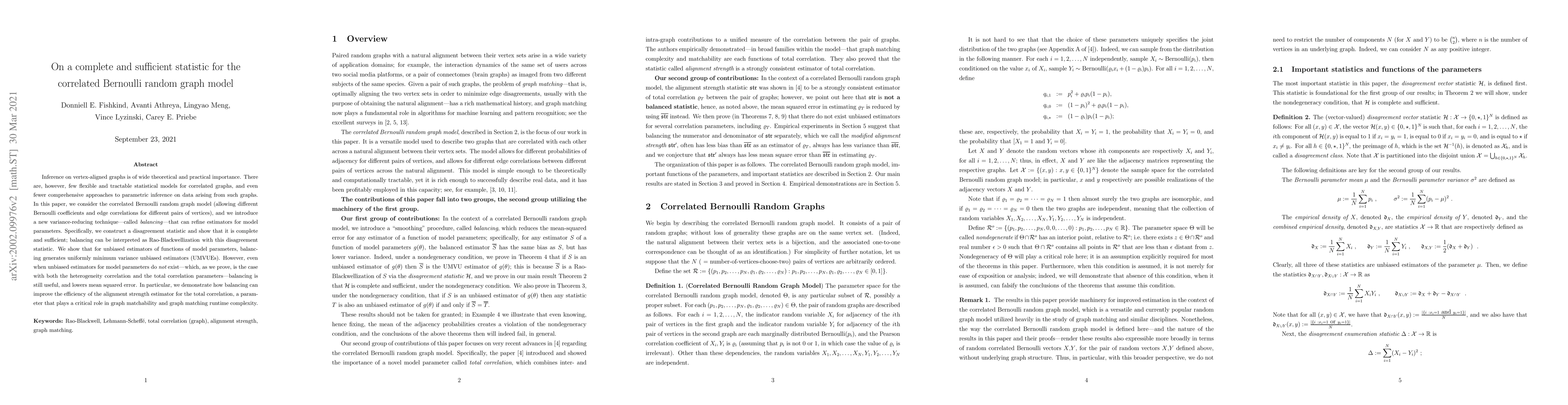 Inference on vertex-aligned graphs is of wide theoretical and practical importance.There are, however, few flexible and tractable statistical models for correlated graphs, and even fewer comprehensive approaches to parametric inference on data arising from such graphs. In this paper, we consider the correlated Bernoulli random graph model (allowing different Bernoulli coefficients and edge correlations for different pairs of vertices), and we introduce a new variance-reducing technique -- called \emph{balancing} -- that can refine estimators for model parameters. Specifically, we construct a disagreement statistic and show that it is complete and sufficient; balancing can be interpreted as Rao-Blackwellization with this disagreement statistic. We show that for unbiased estimators of functions of model parameters, balancing generates uniformly minimum variance unbiased estimators (UMVUEs). However, even when unbiased estimators for model parameters do {\em not} exist -- which, as we prove, is the case with both the heterogeneity correlation and the total correlation parameters -- balancing is still useful, and lowers mean squared error. In particular, we demonstrate how balancing can improve the efficiency of the alignment strength estimator for the total correlation, a parameter that plays a critical role in graph matchability and graph matching runtime complexity.