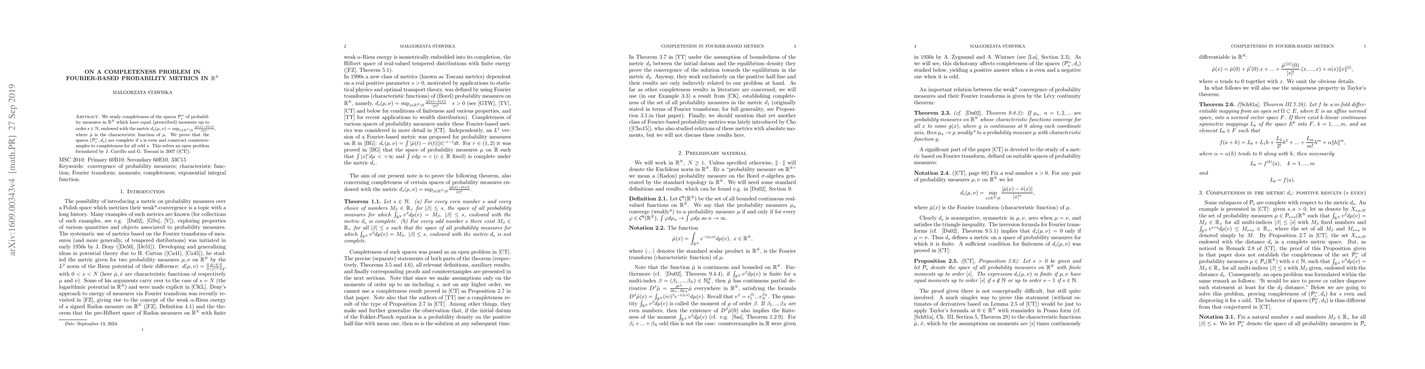 This paper investigates the completeness of spaces of probability measures in $\mathbb{R}^N$ with equal moments up to order $s$, using a Fourier-based metric. The authors prove completeness for even $s$ and provide counterexamples for odd $s$, resolving an open problem posed in 2007.