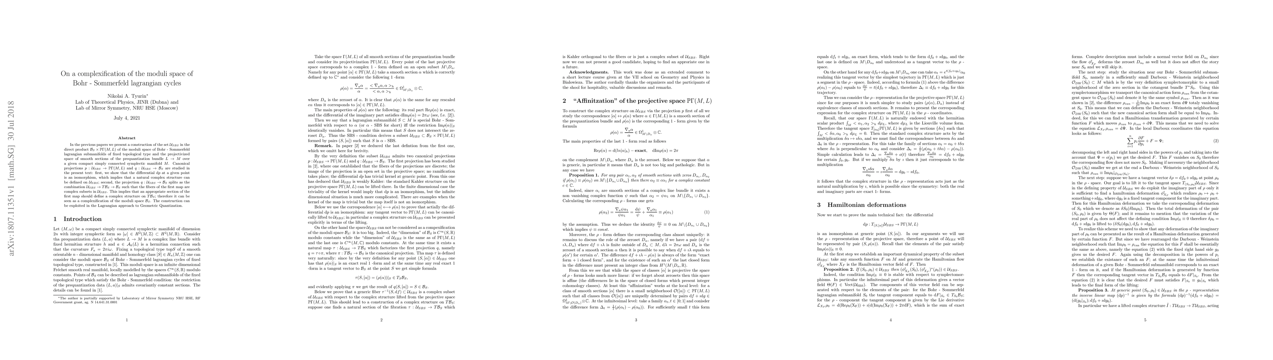 This paper constructs the set ${\cal U}_{SBS}$ in the product of moduli space of Bohr-Sommerfeld Lagrangian cycles and sections of a prequantization bundle. It demonstrates that ${\rm d} p$ is an isomorphism, allowing a natural complex structure on ${\cal U}_{SBS}$, and shows that the projection $q$ splits into a combination that complexifies the moduli space ${\cal B}_S$.