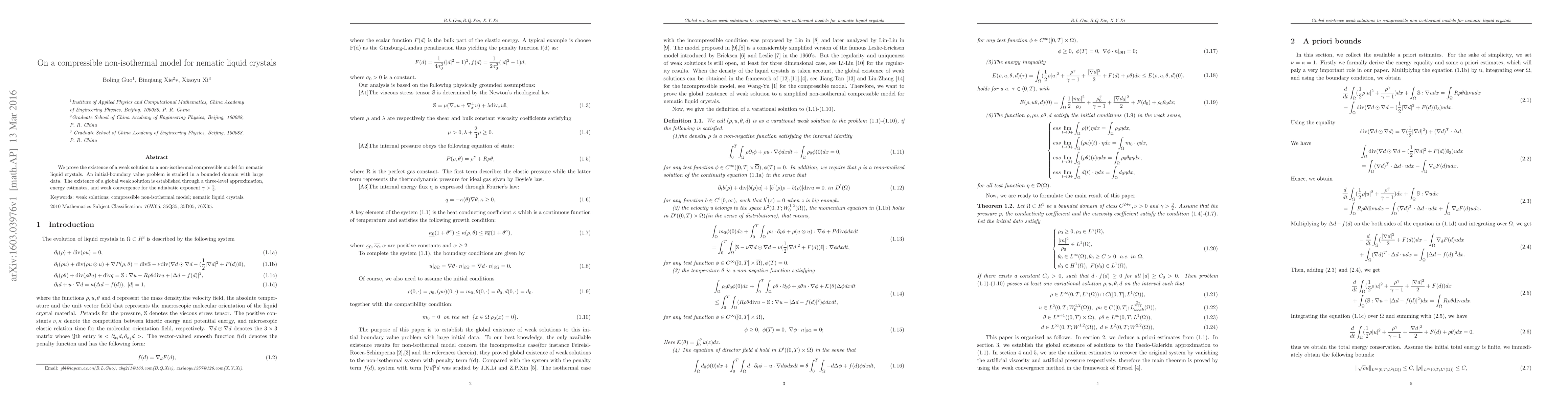 We prove the existence of a weak solution to a non-isothermal compressible model for nematic liquid crystals. An initial-boundary value problem is studied in a bounded domain with large data. The existence of a global weak solution is established through a three-level approximation, energy estimates, and weak convergence for the adiabatic exponent \gamma>3/2.