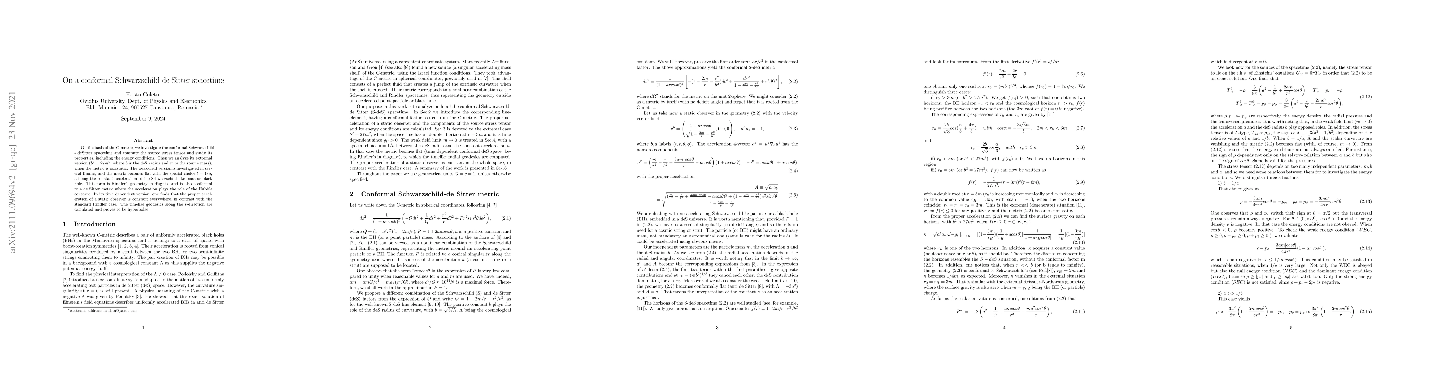 This research paper investigates a conformal Schwarzschild-de Sitter spacetime, analyzing its properties, including the source stress tensor and energy conditions, and finds that it can exhibit unique features such as constant proper acceleration and hyperbolae-like timelike geodesics.