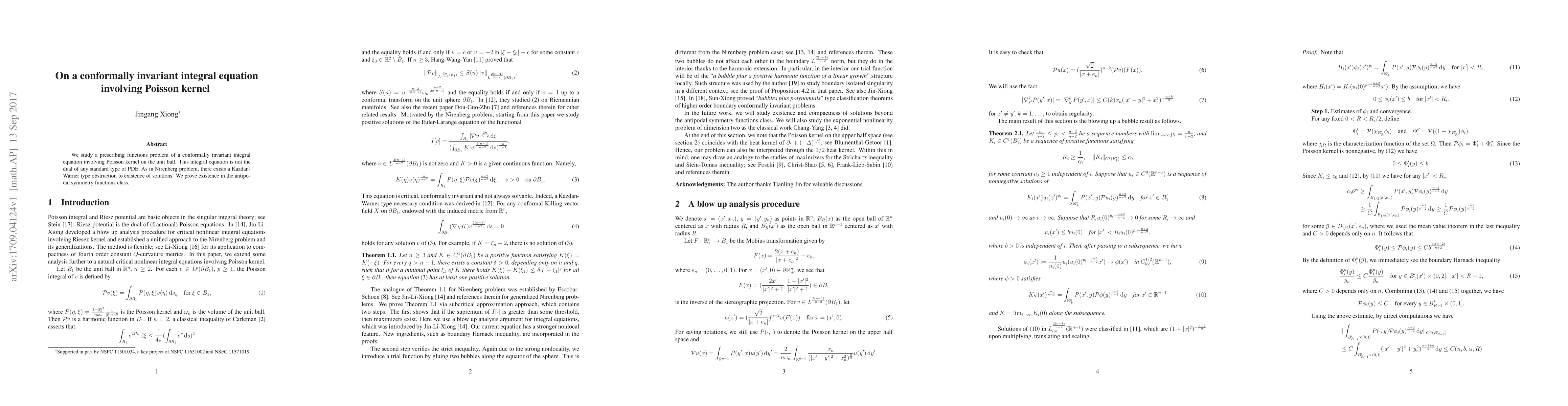 This paper explores a conformally invariant integral equation on the unit ball involving the Poisson kernel, revealing a Kazdan-Warner type obstruction to general solutions. The authors prove the existence of solutions within the class of antipodal symmetric functions.