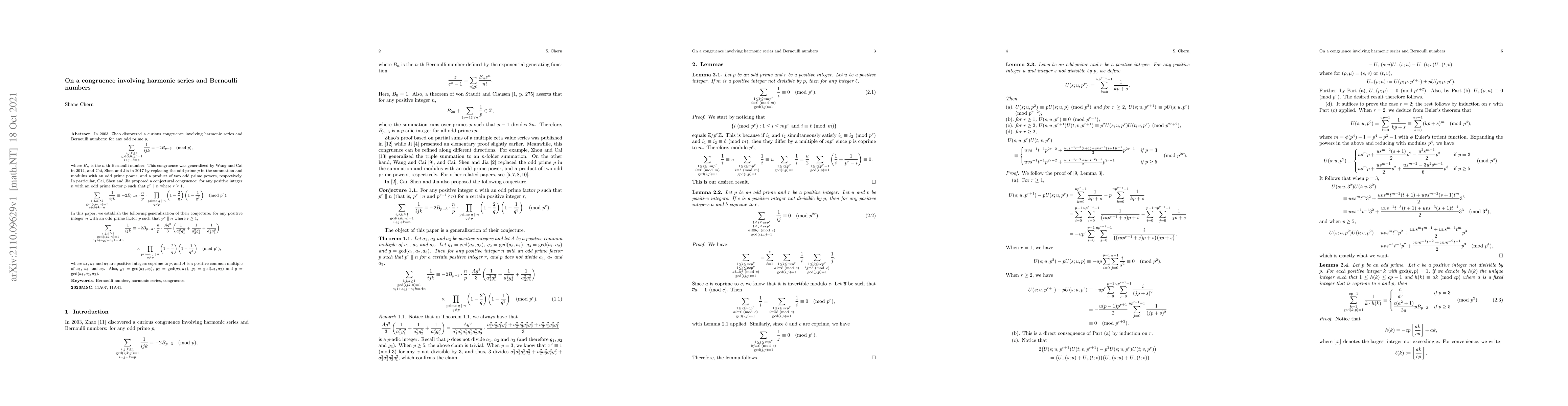 In 2003, Zhao discovered a curious congruence involving harmonic series and Bernoulli numbers: for any odd prime $p$, $$\sum_{\substack{i,j,k\ge 1\\\gcd(ijk,p)=1\\i+j+k=p}}\frac{1}{ijk}\equiv -2B_{p-3} \pmod{p},$$ where $B_n$ is the $n$-th Bernoulli number. This congruence was generalized by Wang and Cai in 2014, and Cai, Shen and Jia in 2017 by replacing the odd prime $p$ in the summation and modulus with an odd prime power, and a product of two odd prime powers, respectively. In particular, Cai, Shen and Jia proposed a conjectural congruence: for any positive integer $n$ with an odd prime factor $p$ such that $p^r \parallel n$ where $r\ge 1$, $$\sum_{\substack{i,j,k\ge 1\\\gcd(ijk,n)=1\\i+j+k=n}}\frac{1}{ijk}\equiv -2B_{p-3}\cdot \frac{n}{p}\cdot \prod_{\substack{\text{prime $q\mid n$}\\q\ne p}}\left(1-\frac{2}{q}\right)\left(1-\frac{1}{q^3}\right) \pmod{p^r}.$$ In this paper, we establish the following generalization of their conjecture: for any positive integer $n$ with an odd prime factor $p$ such that $p^r \parallel n$ where $r\ge 1$, $$\begin{aligned} \sum_{\substack{i,j,k\ge 1\\\gcd(ijk,n)=1\\a_1 i+a_2 j+a_3 k=An}}\frac{1}{ijk}&\equiv -2B_{p-3}\cdot \frac{n}{p}\cdot \frac{Ag^3}{3}\left(\frac{1}{a_1^2 g_1^2}+\frac{1}{a_2^2 g_2^2}+\frac{1}{a_3^2 g_3^2}\right)\\ &\quad\times \prod_{\substack{\text{prime $q\mid n$}\\q\ne p}}\left(1-\frac{2}{q}\right)\left(1-\frac{1}{q^3}\right) \pmod{p^r}, \end{aligned}$$ where $a_1$, $a_2$ and $a_3$ are positive integers coprime to $p$, and $A$ is a positive common multiple of $a_1$, $a_2$ and $a_3$. Also, $g_1=\gcd(a_2,a_3)$, $g_2=\gcd(a_3,a_1)$, $g_3=\gcd(a_1,a_2)$ and $g=\gcd(a_1,a_2,a_3)$.