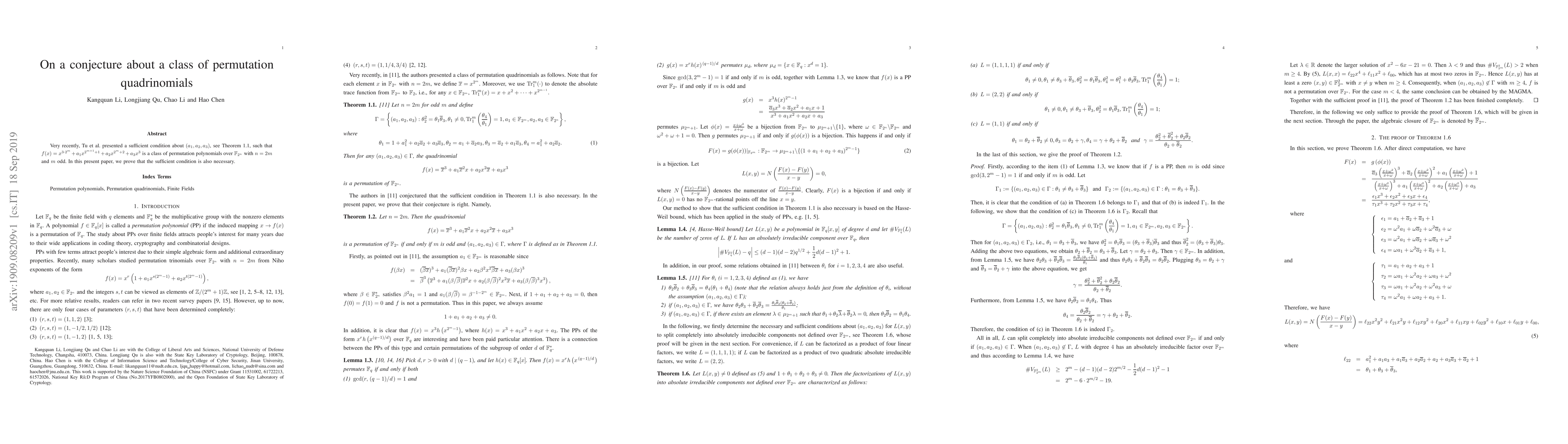 Very recently, Tu et al. presented a sufficient condition about $(a_1,a_2,a_3)$, see Theorem 1.1, such that $f(x) = x^{3\cdot 2^m} + a_1 x^{2^{m+1}+1}+ a_2 x^{2^m+2} + a_3 x^3$ is a class of permutation polynomials over $\gf_{2^{n}}$ with $n=2m$ and $m$ odd. In this present paper, we prove that the sufficient condition is also necessary.