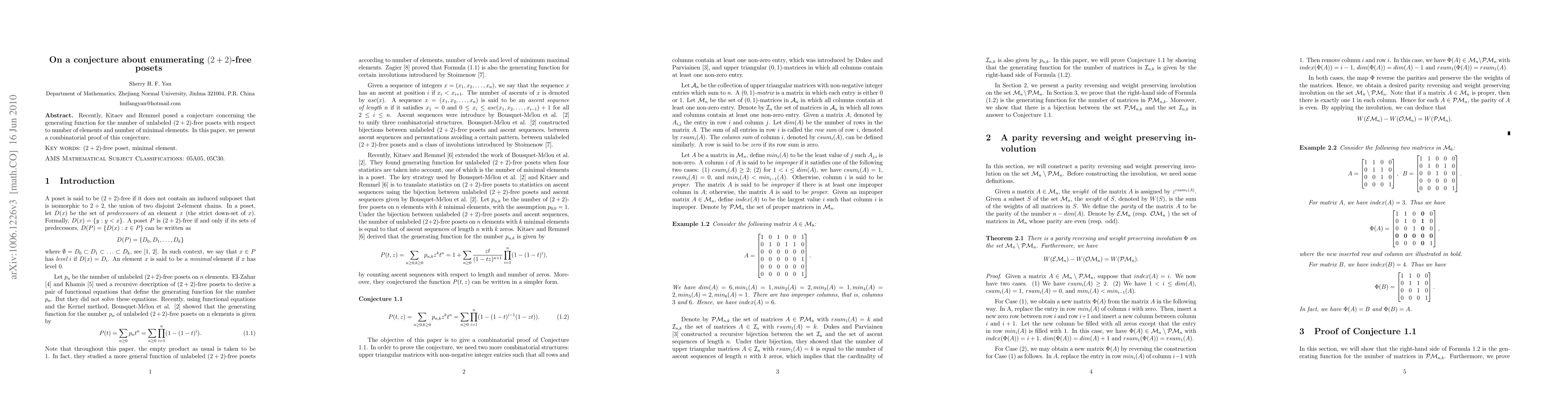 This paper provides a combinatorial proof for the conjecture by Kitaev and Remmel regarding the generating function for the enumeration of $(2+2)$-free posets based on their size and number of minimal elements. The authors offer a novel approach to validate this conjecture.