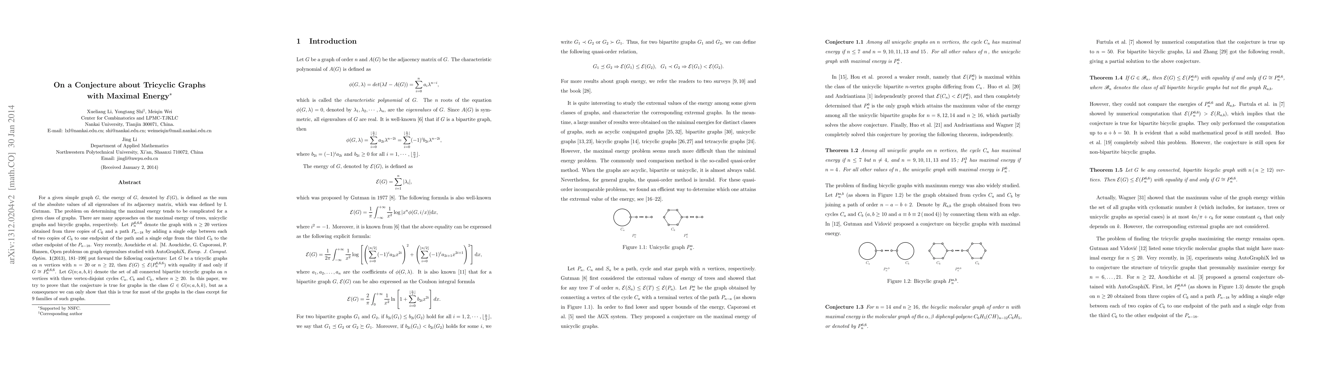 This paper investigates a conjecture regarding the maximal energy of tricyclic graphs, specifically focusing on the class $G(n;a,b,k)$ of connected bipartite tricyclic graphs with three vertex-disjoint cycles. The authors prove the conjecture holds for most graphs in this class but identify 9 families where it does not apply.