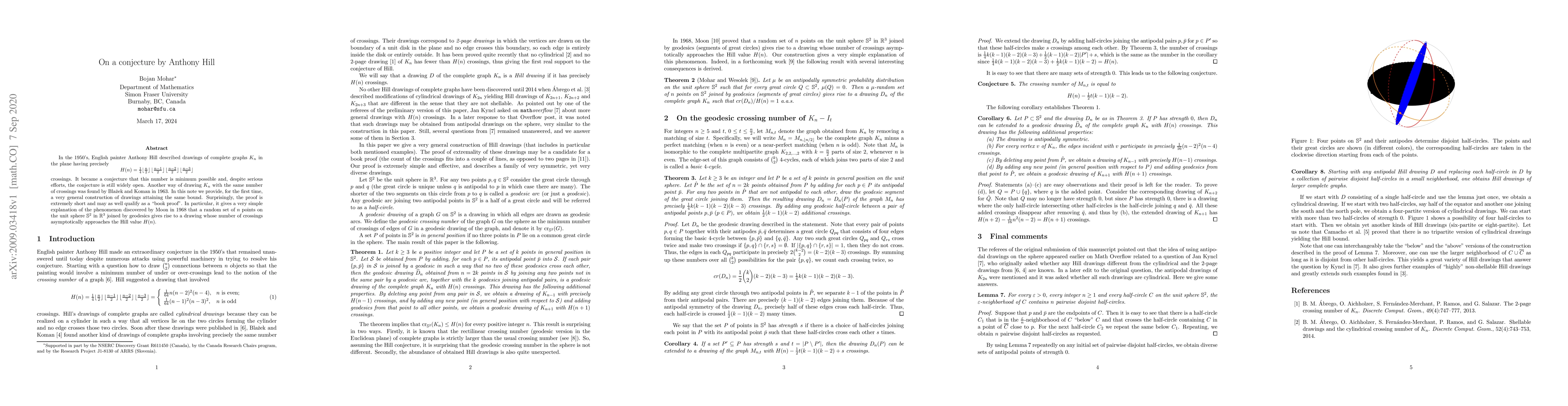 In the 1950's, English painter Anthony Hill described drawings of complete graphs $K_n$ in the plane having precisely $$H(n) = \tfrac{1}{4}\lfloor \tfrac{n}{2}\rfloor \, \lfloor \tfrac{n-1}{2}\rfloor \, \lfloor \tfrac{n-2}{2}\rfloor \,\lfloor \tfrac{n-3}{2}\rfloor$$ crossings. It became a conjecture that this number is minimum possible and, despite serious efforts, the conjecture is still widely open. Another way of drawing $K_n$ with the same number of crossings was found by Bla\v{z}ek and Koman in 1963. In this note we provide, for the first time, a very general construction of drawings attaining the same bound. Surprisingly, the proof is extremely short and may as well qualify as a "book proof". In particular, it gives a very simple explanation of the phenomenon discovered by Moon in 1968 that a random set of $n$ points on the unit sphere $\SS^2$ in $\RR^3$ joined by geodesics gives rise to a drawing whose number of crossings asymptotically approaches the Hill value $H(n)$.