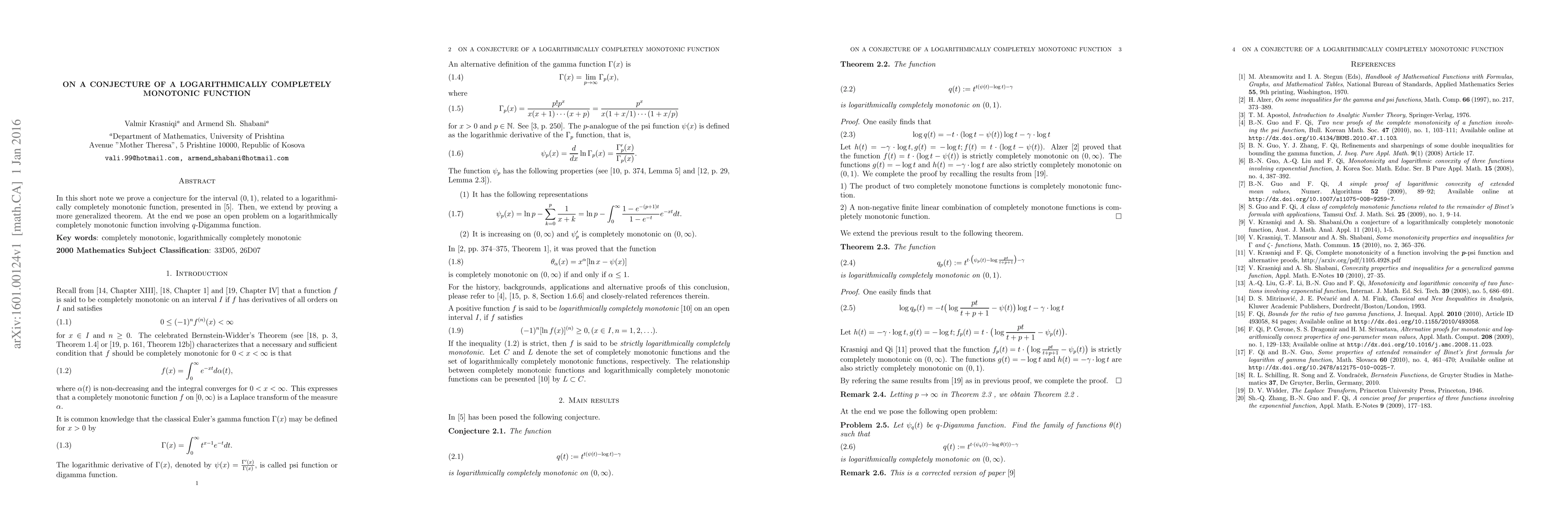 This paper proves a conjecture about a logarithmically completely monotonic function on the interval $(0,1)$ and extends it with a generalized theorem. An open problem involving the $q$-Digamma function is also proposed.