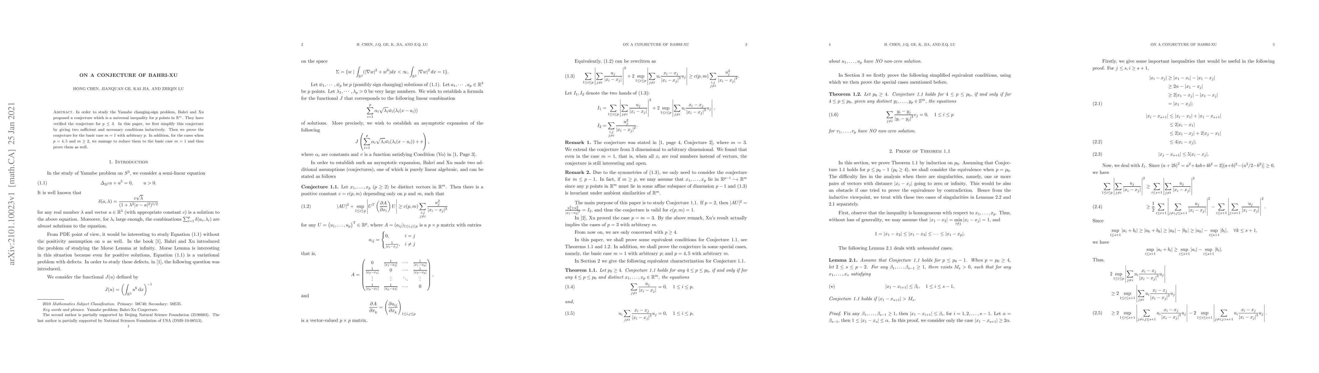 In order to study the Yamabe changing-sign problem, Bahri and Xu proposed a conjecture which is a universal inequality for $p$ points in $\mathbb R^m$. They have verified the conjecture for $p\leq3$. In this paper, we first simplify this conjecture by giving two sufficient and necessary conditions inductively. Then we prove the conjecture for the basic case $m=1$ with arbitrary $p$. In addition, for the cases when $p=4,5$ and $m\geq2$, we manage to reduce them to the basic case $m=1$ and thus prove them as well.