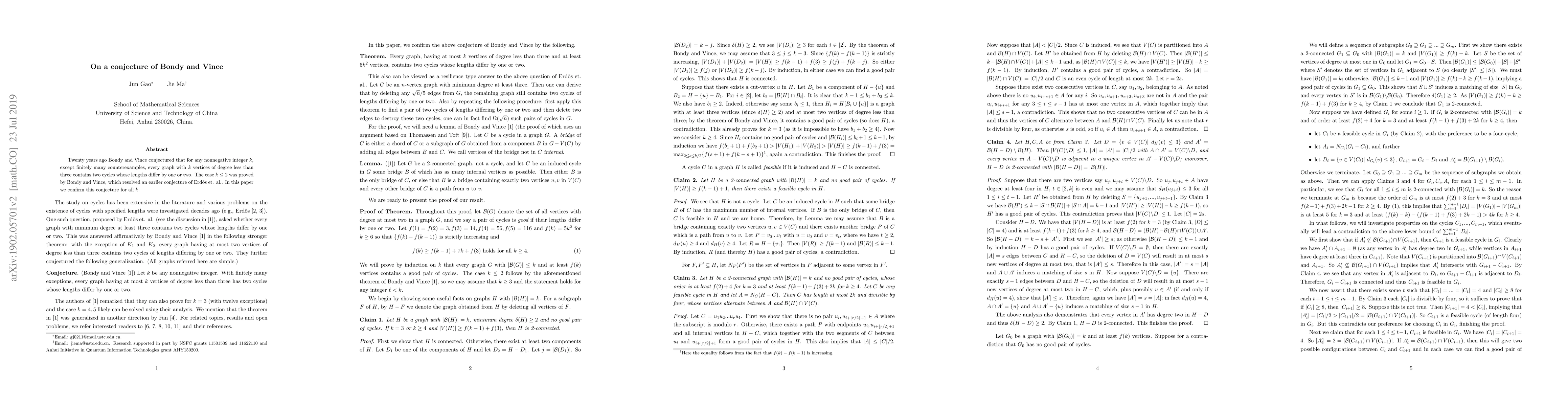 Twenty years ago Bondy and Vince conjectured that for any nonnegative integer $k$, except finitely many counterexamples, every graph with $k$ vertices of degree less than three contains two cycles whose lengths differ by one or two. The case $k\leq 2$ was proved by Bondy and Vince, which resolved an earlier conjecture of Erd\H{o}s et. al.. In this paper we confirm this conjecture for all $k$.