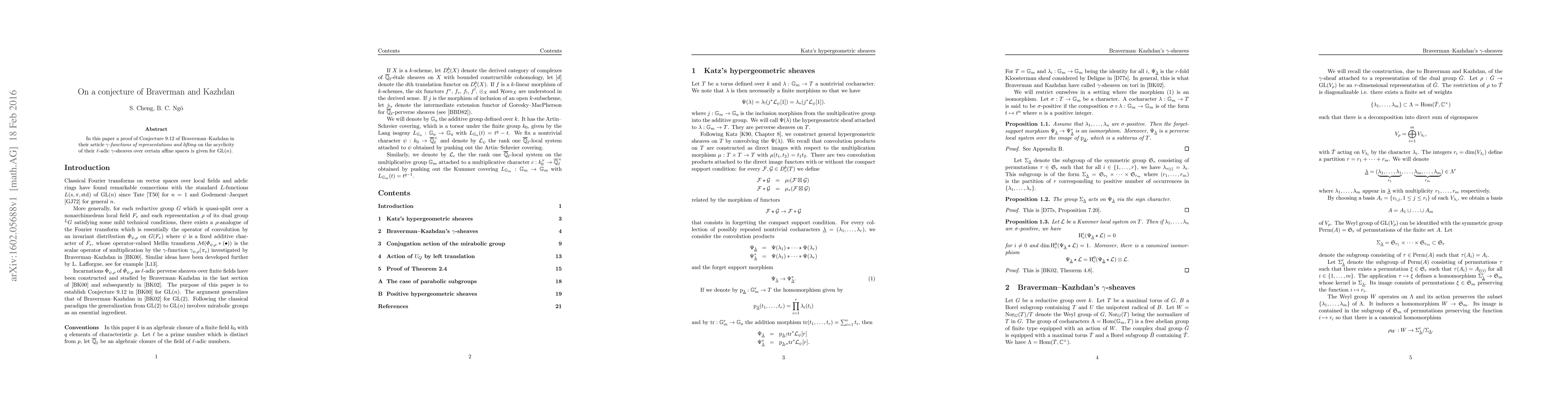In this paper a proof of Conjecture 9.12 of Braverman and Kazhdan in their article "gamma-functions of representations and lifting" on the acyclicity of their l-adic gamma-sheaves over certain affine spaces is given for GL(n).