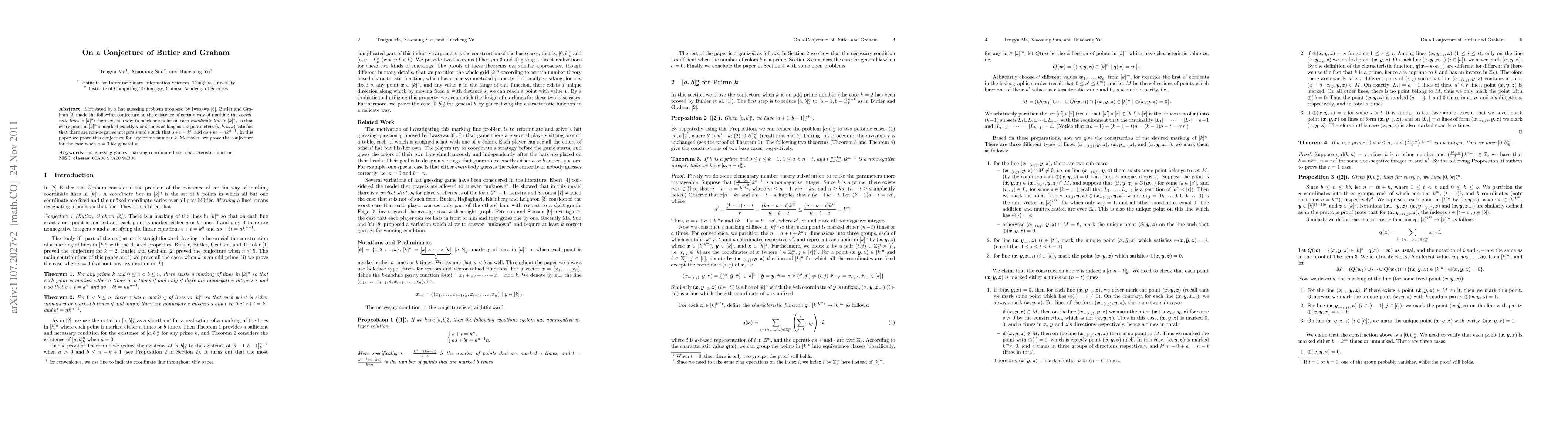 Motivated by a hat guessing problem proposed by Iwasawa \cite{Iwasawa10}, Butler and Graham \cite{Butler11} made the following conjecture on the existence of certain way of marking the {\em coordinate lines} in $[k]^n$: there exists a way to mark one point on each {\em coordinate line} in $[k]^n$, so that every point in $[k]^n$ is marked exactly $a$ or $b$ times as long as the parameters $(a,b,n,k)$ satisfies that there are non-negative integers $s$ and $t$ such that $s+t = k^n$ and $as+bt = nk^{n-1}$. In this paper we prove this conjecture for any prime number $k$. Moreover, we prove the conjecture for the case when $a=0$ for general $k$.