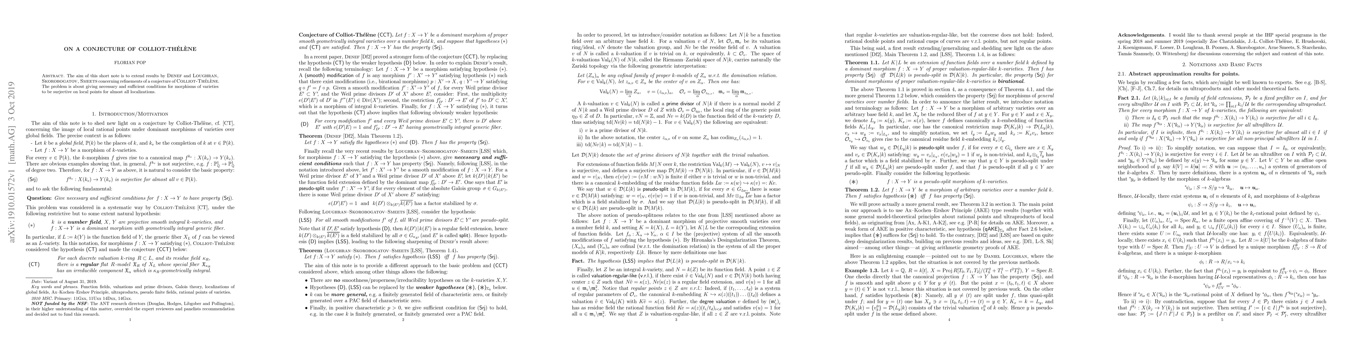The aim of this short note is to extend results by Denef and Loughran, Skorobogatov, Smeets concerning refinements of a conjecture of Colliot-Thelene. The problem is about giving necessary and sufficient conditions for morphisms of varieties to be surjective on local points for almost all localizations.