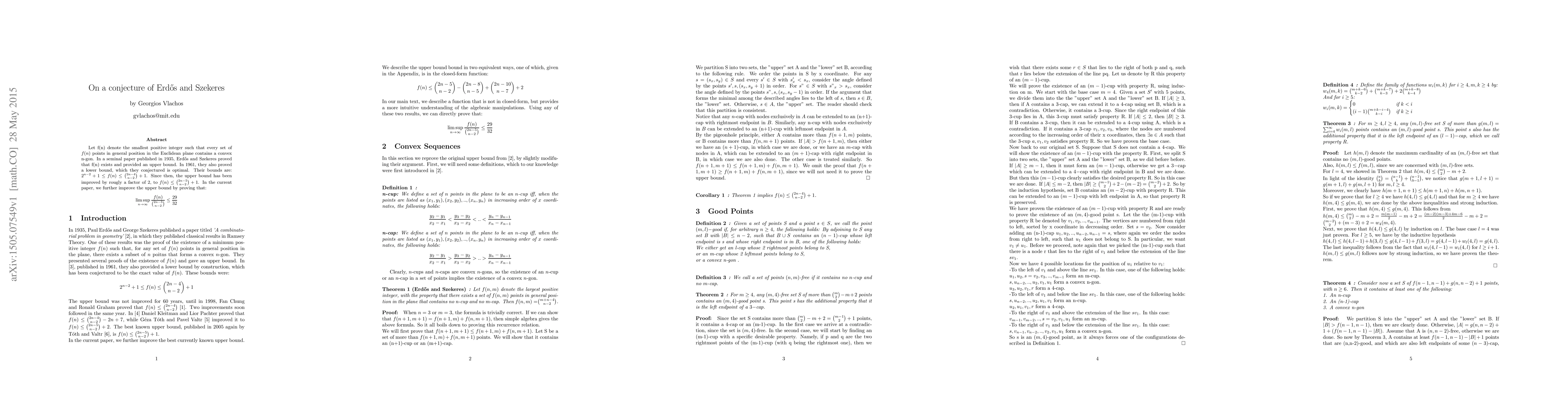 Let f(n) denote the smallest positive integer such that every set of $f(n)$ points in general position in the Euclidean plane contains a convex n-gon. In a seminal paper published in 1935, Erd\H{o}s and Szekeres proved that f(n) exists and provided an upper bound. In 1961, they also proved a lower bound, which they conjectured is optimal. Their bounds are: $2^{n-2}+1 \leq f(n) \leq {2n - 4 \choose n-2}+1$. Since then, the upper bound has been improved by rougly a factor of 2, to $f(n) \leq {2n - 5 \choose n-2}+1$. In the current paper, we further improve the upper bound by proving that: $$ \limsup\limits_{n\rightarrow \infty} \frac{f(n)}{{2n-5 \choose n-2}} \leq \frac{29}{32}$$