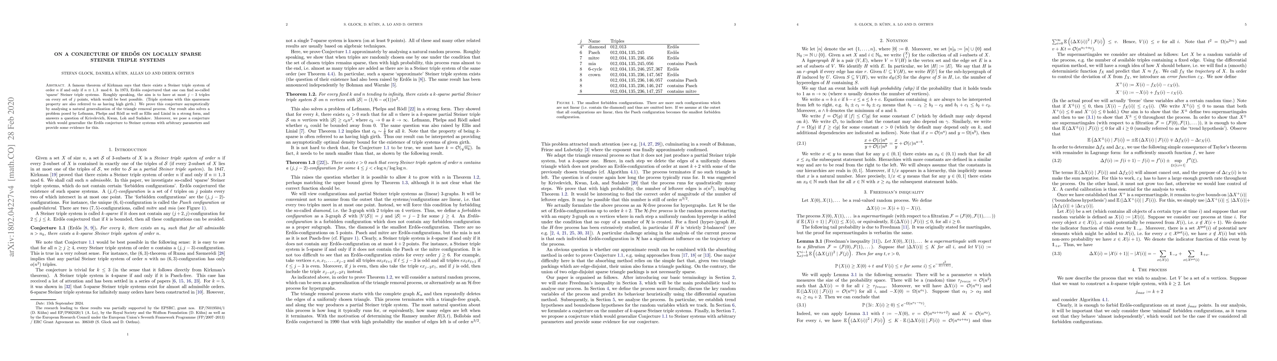 Researchers prove Erdos' conjecture on sparse Steiner triple systems asymptotically, solving problems posed by others and generalizing to arbitrary parameters.