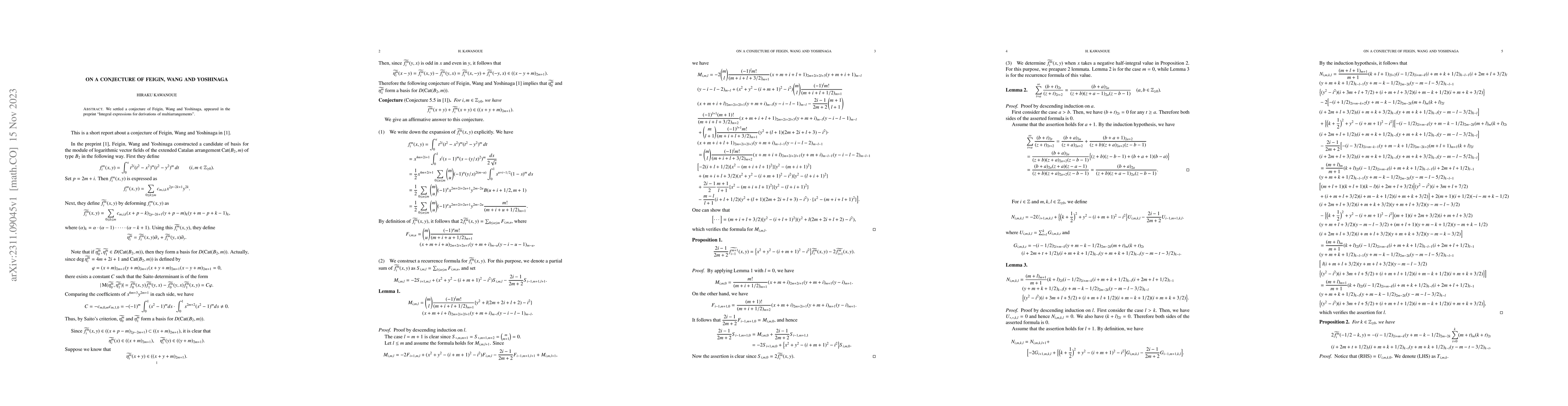This paper confirms a conjecture by Feigin, Wang, and Yoshinaga regarding integral expressions for derivations of multiarrangements, as originally proposed in their preprint "Integral expressions for derivations of multiarrangements" (arXiv:2309.01287v2). The results provide a significant advancement in understanding multiarrangement derivations.