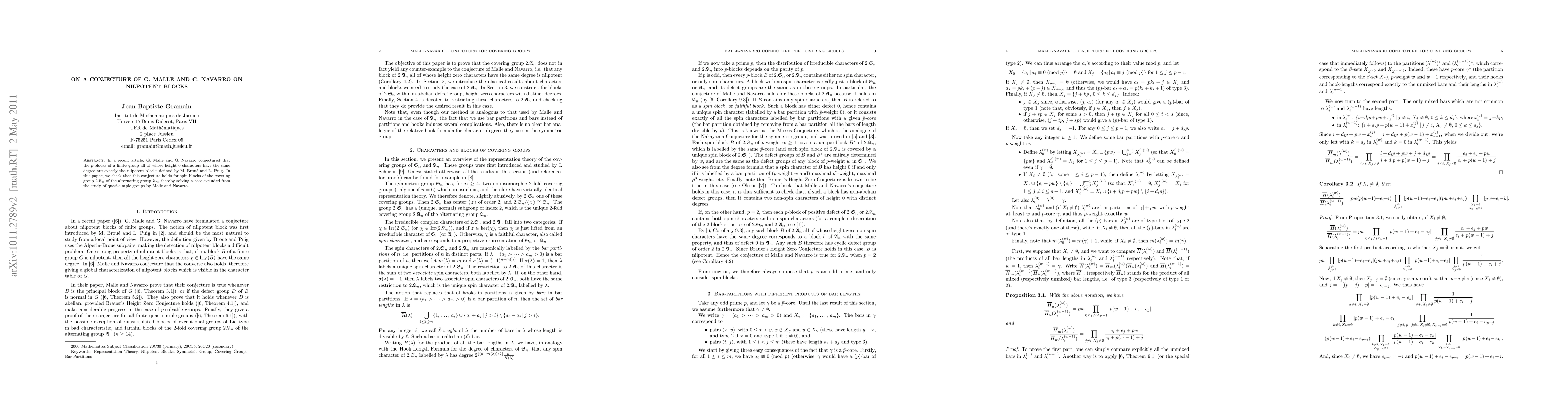 This paper verifies G. Malle and G. Navarro's conjecture that the $p$-blocks of a finite group with uniform height 0 characters are nilpotent blocks, specifically for the spin-blocks of the covering group $2.\A_n$ of the alternating group $\A_n$. This resolves a previously excluded case for quasi-simple groups.