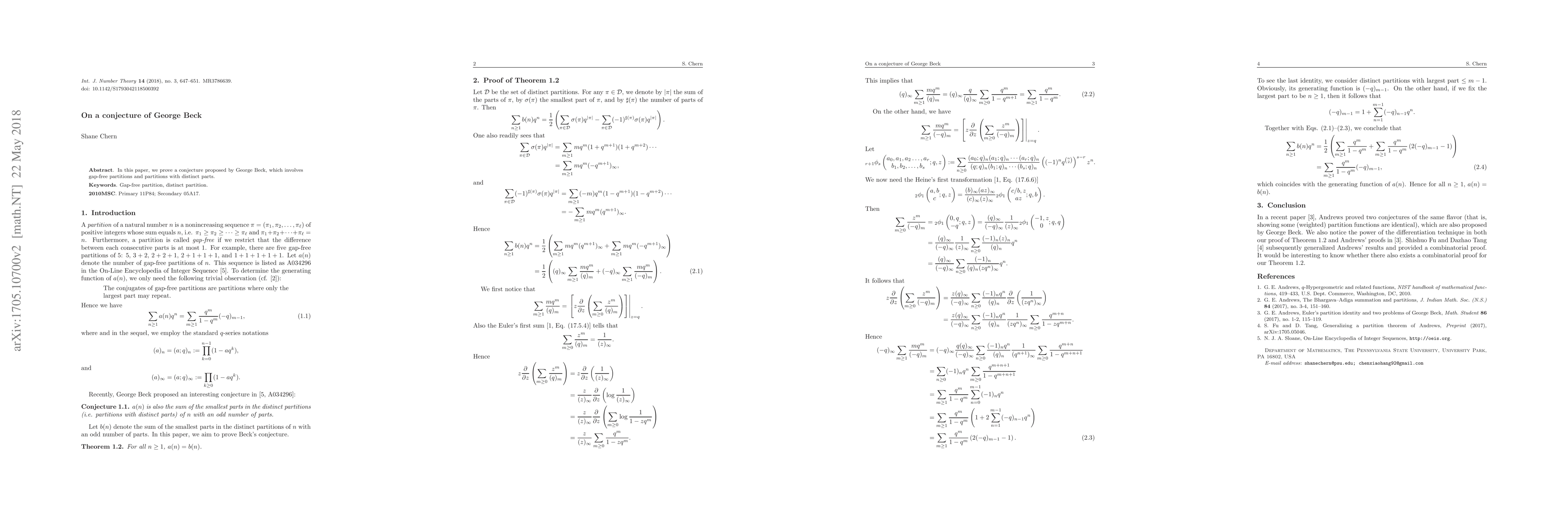 In this paper, we prove a conjecture proposed by George Beck, which involves gap-free partitions and partitions with distinct parts.