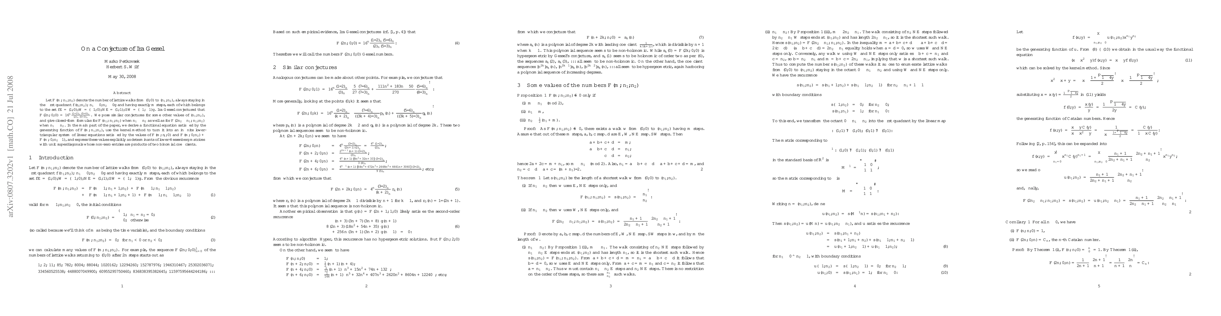 Let F(m; n1, n2) denote the number of lattice walks from (0,0) to (n1,n2), always staying in the first quadrant {(n_1,n_2); n1 >= 0, n2 >= 0} and having exactly m steps, each of which belongs to the set {E=(1,0), W=(-1,0), NE=(1,1), SW=(-1,-1)}. Ira Gessel conjectured that F(2n; 0, 0) = 16^n (1/2)_n (5/6)_n / ((2)_n (5/3)_n) where (a)_n is the Pochhammer symbol. We pose similar conjectures for some other values of (n1,n2), and give closed-form formulas for F(n1; n1, n2) when n1 >= n2 as well as for F(2n2 - n1; n1, n2) when n1 <= n2. In the main part of the paper, we derive a functional equation satisfied by the generating function of F(m; n1, n2), use the kernel method to turn it into an infinite lower-triangular system of linear equations satisfied by the values of F(m; n1, 0) and F(m; 0, n2) + F(m; 0, n2 - 1), and express these values explicitly as determinants of lower-Hessenberg matrices with unit superdiagonals whose non-zero entries are products of two binomial coefficients.