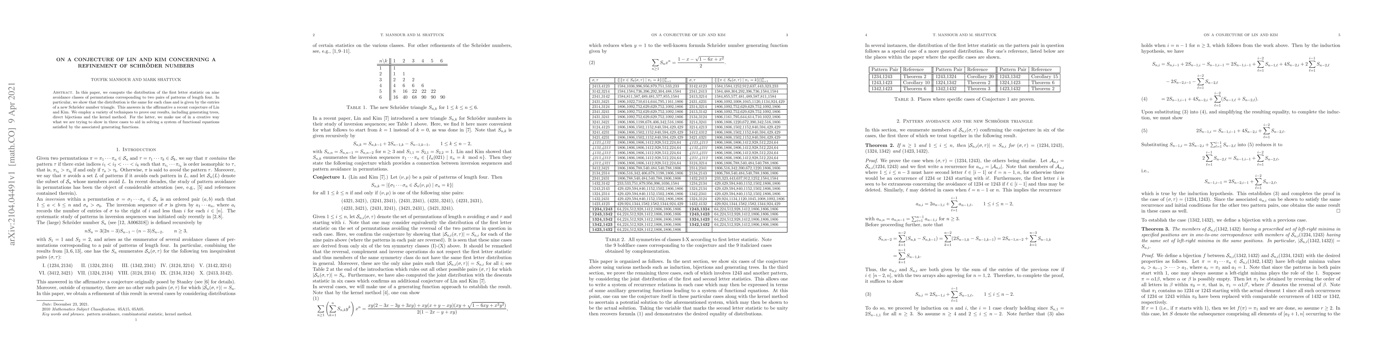 In this paper, we compute the distribution of the first letter statistic on nine avoidance classes of permutations corresponding to two pairs of patterns of length four. In particular, we show that the distribution is the same for each class and is given by the entries of a new Schr\"oder number triangle. This answers in the affirmative a recent conjecture of Lin and Kim. We employ a variety of techniques to prove our results, including generating trees, direct bijections and the kernel method. For the latter, we make use of in a creative way what we are trying to show in three cases to aid in solving a system of functional equations satisfied by the associated generating functions.
