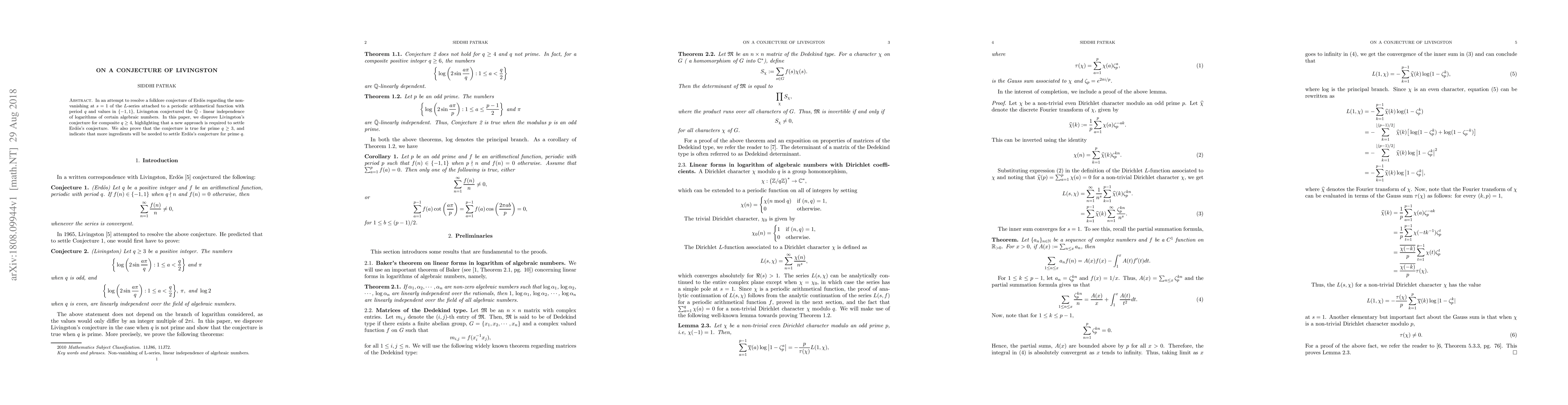 In an attempt to resolve a folklore conjecture of Erd\H{o}s regarding the non-vanishing at $s=1$ of the $L$-series attached to a periodic arithmetical function with period $q$ and values in $\{-1, 1 \}$, Livingston conjectured the $\overline{\mathbb{Q}}$ - linear independence of logarithms of certain algebraic numbers. In this paper, we disprove Livingston's conjecture for composite $q \geq 4$, highlighting that a new approach is required to settles Erd\H{o}s's conjecture. We also prove that the conjecture is true for prime $q \geq 3$, and indicate that more ingredients are needed to settle Erd\H{o}s's conjecture for prime $q$.