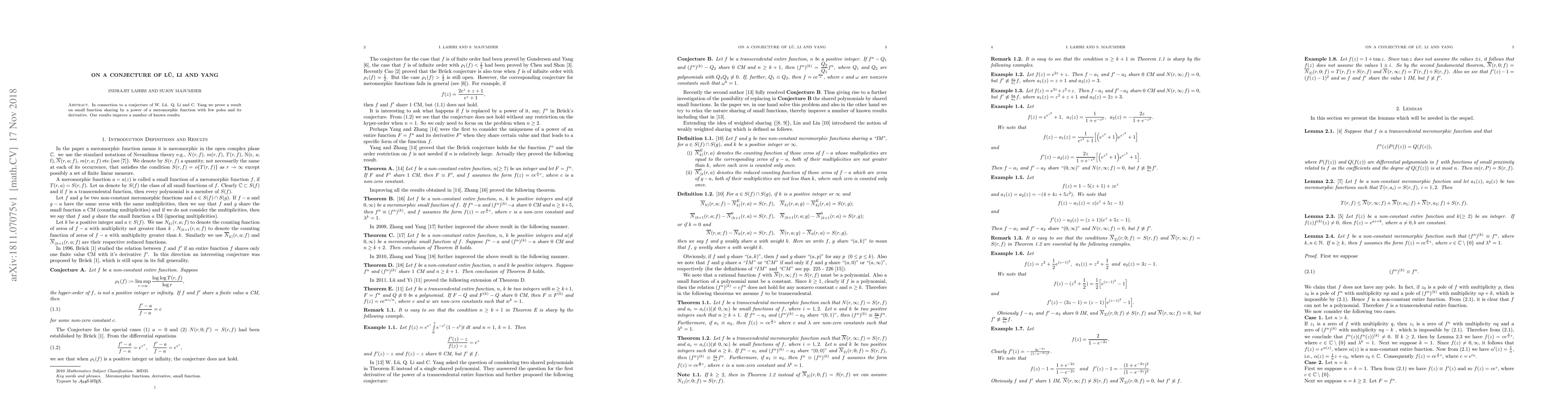 In connection to a conjecture of W. L\"u. Q. Li and C. Yang we prove a result on small function sharing by a power of a meromorphic function with few poles and its derivative. Our results improve a number of known results.