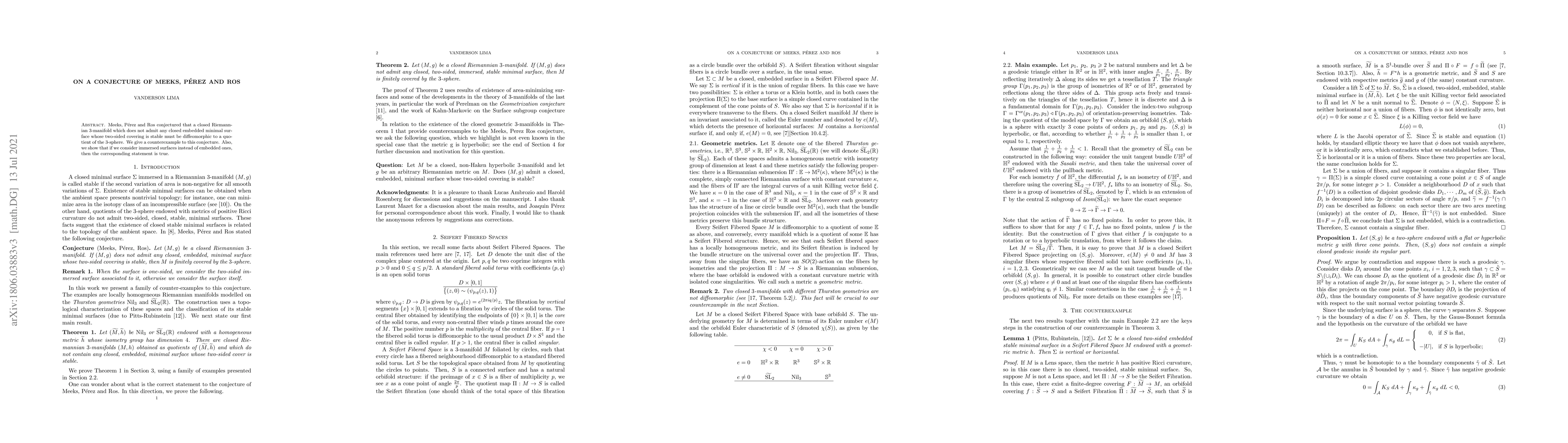 Meeks, P\'erez and Ros conjectured that a closed Riemannian $3$-manifold which does not admit any closed embedded minimal surface whose two-sided covering is stable, must be diffeomorphic to a quotient of the $3$-sphere. We give an counterexample to this conjecture. Also, we show that if we consider immersed surfaces instead of embedded ones, then the corresponding statement is true.