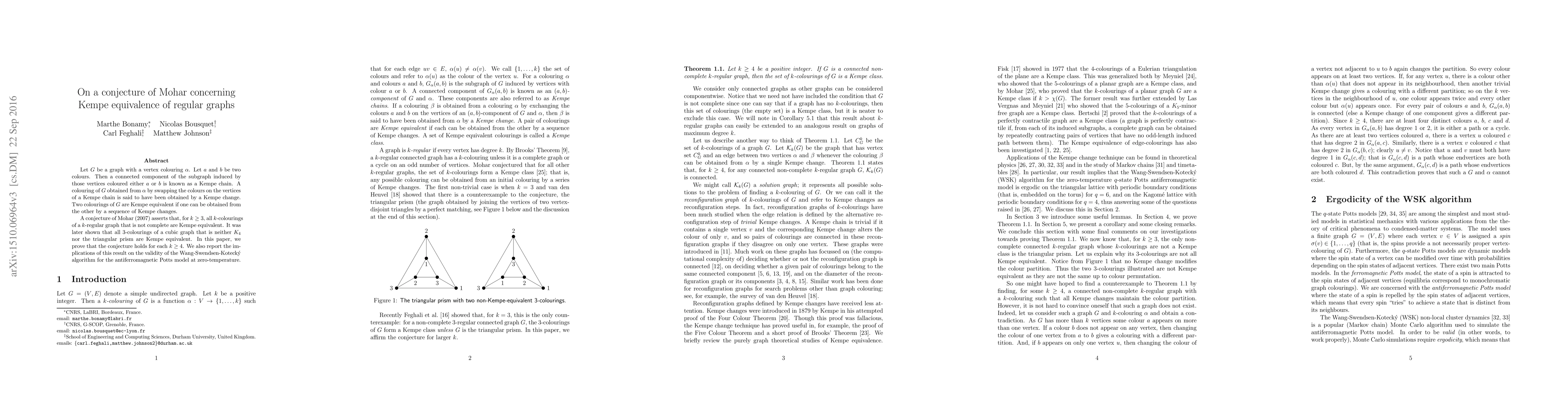 This paper proves Mohar's conjecture for $k \geq 4$, showing that all $k$-colourings of a $k$-regular graph that is not complete are Kempe equivalent. It also discusses implications for the Wang-Swendsen-Koteckỳ algorithm in the context of the antiferromagnetic Potts model at zero temperature.
