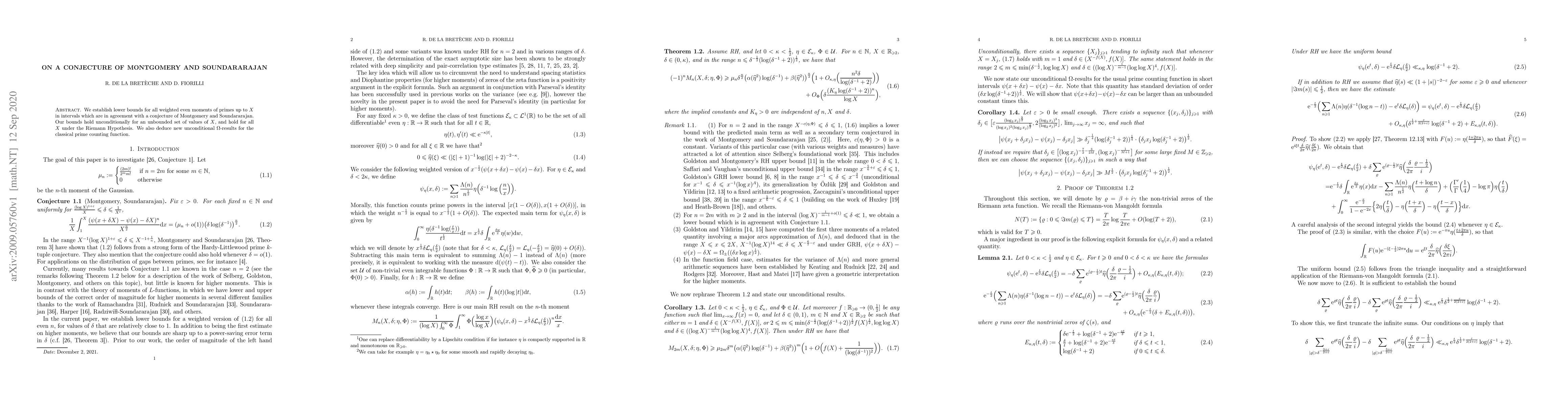 We establish lower bounds for all weighted even moments of primes up to $X$ in intervals which are in agreement with a conjecture of Montgomery and Soundararajan. Our bounds hold unconditionally for an unbounded set of values of $X$, and hold for all $X$ under the Riemann Hypothesis. We also deduce new unconditional $\Omega$-results for the classical prime counting function.
