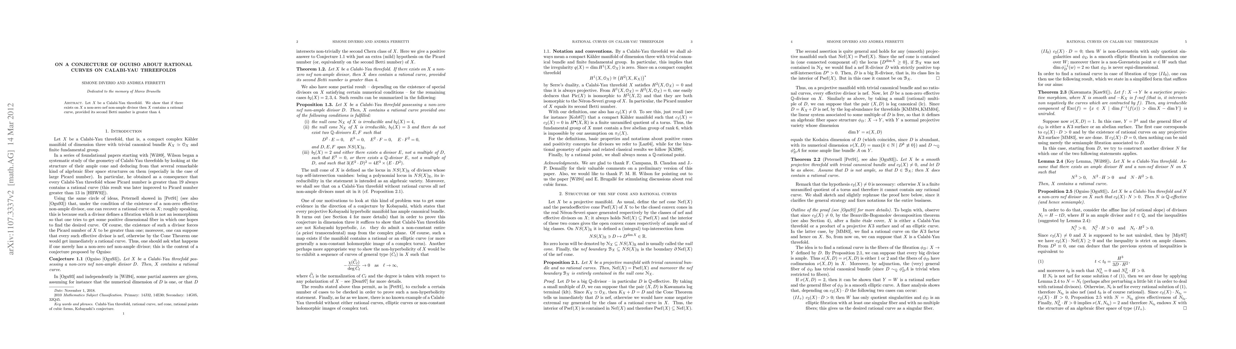 This paper proves Oguiso's conjecture that a Calabi-Yau threefold X containing a non-zero nef non-ample divisor has a rational curve, given that X's second Betti number exceeds 4. The result establishes a connection between divisor properties and the existence of rational curves on these complex geometric spaces.