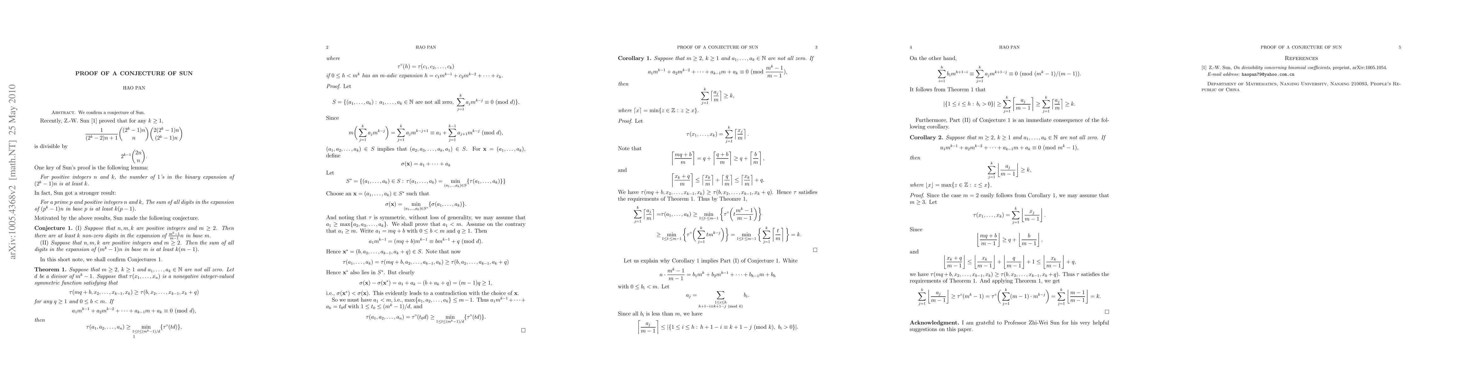 We confirm a conjecture of Sun on the expansions of $n(m^k-1)/(m-1)$ in base $m$.