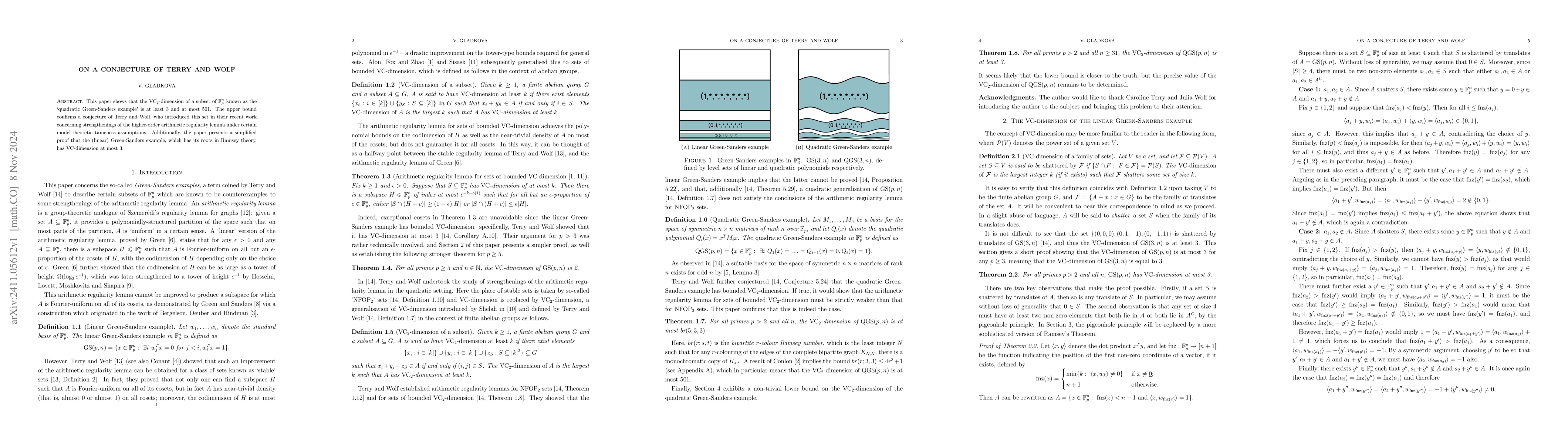 This paper shows that the $\mathrm{VC}_2$-dimension of a subset of $\mathbb{F}_p^n$ known as the 'quadratic Green-Sanders example' is at least 3 and at most 501. The upper bound confirms a conjecture of Terry and Wolf, who introduced this set in their recent work concerning strengthenings of the higher-order arithmetic regularity lemma under certain model-theoretic tameness assumptions. Additionally, the paper presents a simplified proof that the (linear) Green-Sanders example, which has its roots in Ramsey theory, has $\mathrm{VC}$-dimension at most 3.
