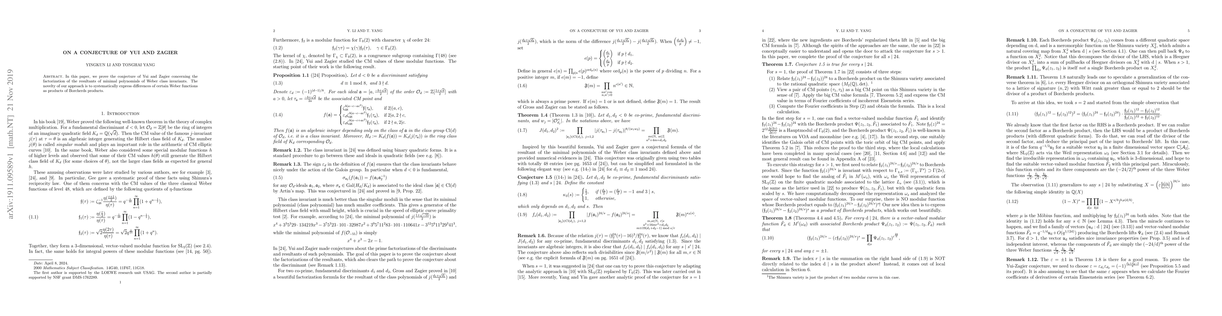 In this paper, we prove the conjecture of Yui and Zagier concerning the factorization of the resultants of minimal polynomials of Weber class invariants. The novelty of our approach is to systematically express differences of certain Weber functions as products of Borcherds products.