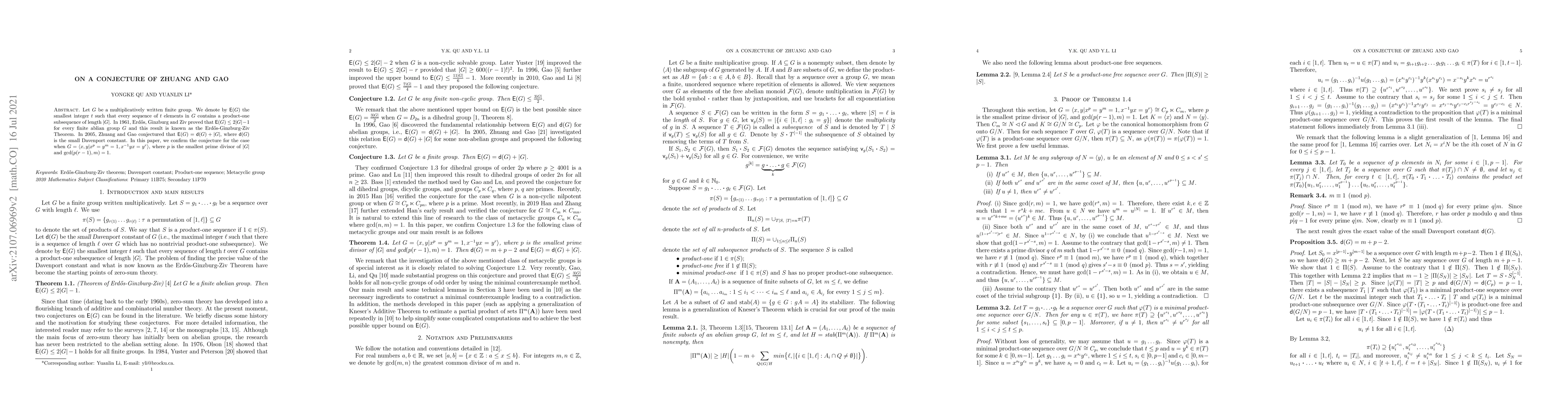 Researchers confirm a conjecture about group sequences in finite groups, specifically for a certain type of abelian group with specific properties. They prove that the smallest integer t such that every sequence of t elements contains a product-one subsequence is equal to the small Davenport constant plus the size of the group.