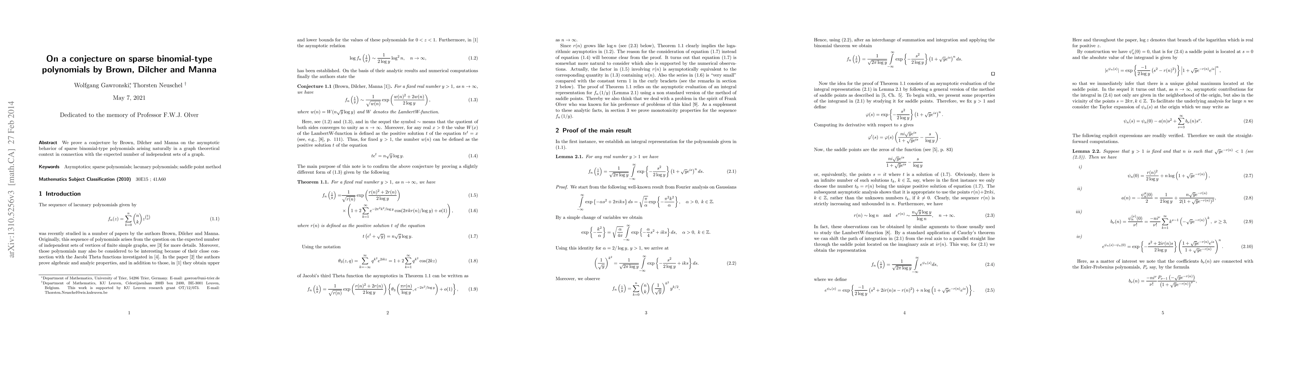 We prove a conjecture by Brown, Dilcher and Manna on the asymptotic behavior of sparse binomial-type polynomials arising naturally in a graph theoretical context in connection with the expected number of independent sets of a graph.