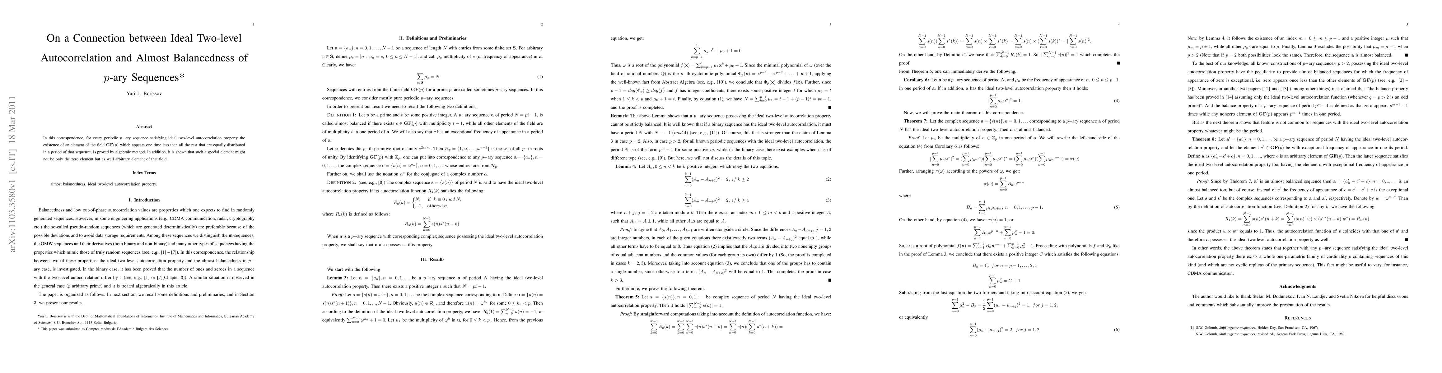 A research paper proves that for periodic p-ary sequences with ideal two-level autocorrelation, there exists an element in the field GF(p) that appears one time less than others, which can be any non-zero element, not just zero.